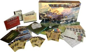 Each ship comes with a card detailing the armaments, engine power, stabilisers and other equipment particular to each class of ship. Players take turns manuevering their ships and bringing their weapons to bear on the enemy. Combat results are determined with multiple colored dice which factor in the strength of firing weapons, the durability of an opponent’s armor, the placement of hits and the presence of crew. As ships take fire, their effectiveness in movement, combat and the ability to make repairs is affected. Multiple hits to the same area of a ship may result in a hull breach and the ship crashing to earth in a hulk of flame and twisted steel.