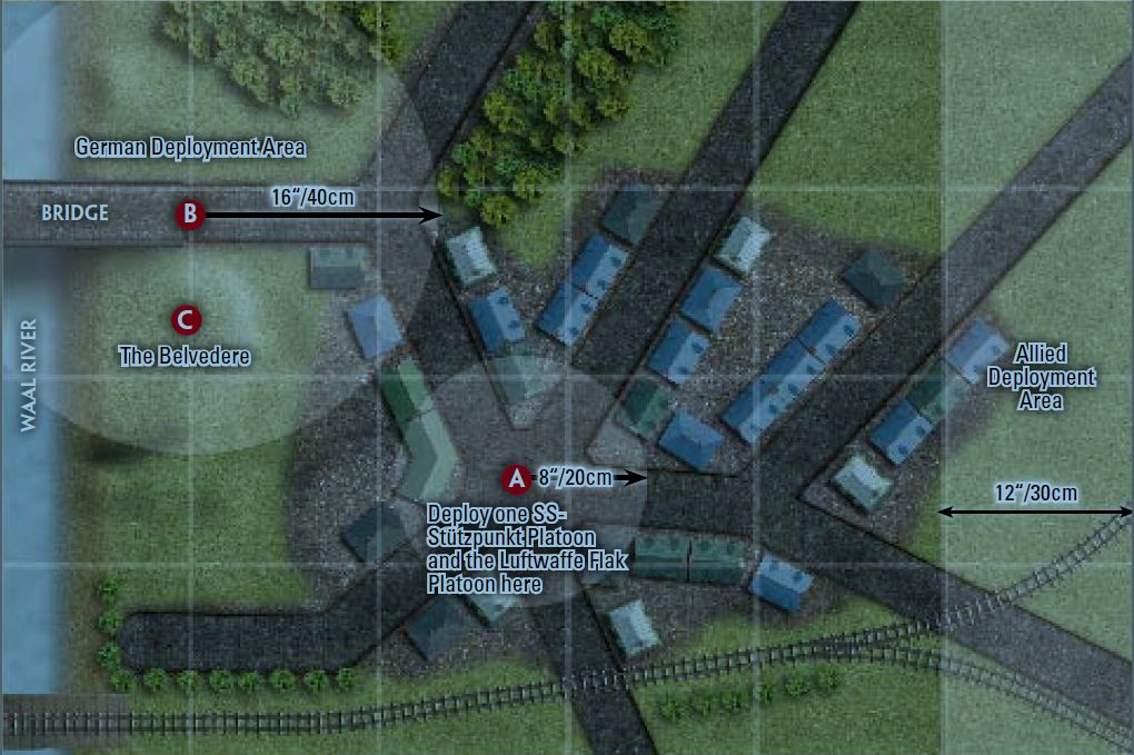 This past weekend at Metropolitan Wargamers, two of us threw together a quick Flames of War game based on the doomed Allied attempt to take the large bridge over the Waal River at Nijmegen, the oldest city in the Netherlands. Battlefront Miniatures, the makers of Flames of War, offer a PDF of the Hunner Park scenario which we used to broadly set the scene using the diagram below.