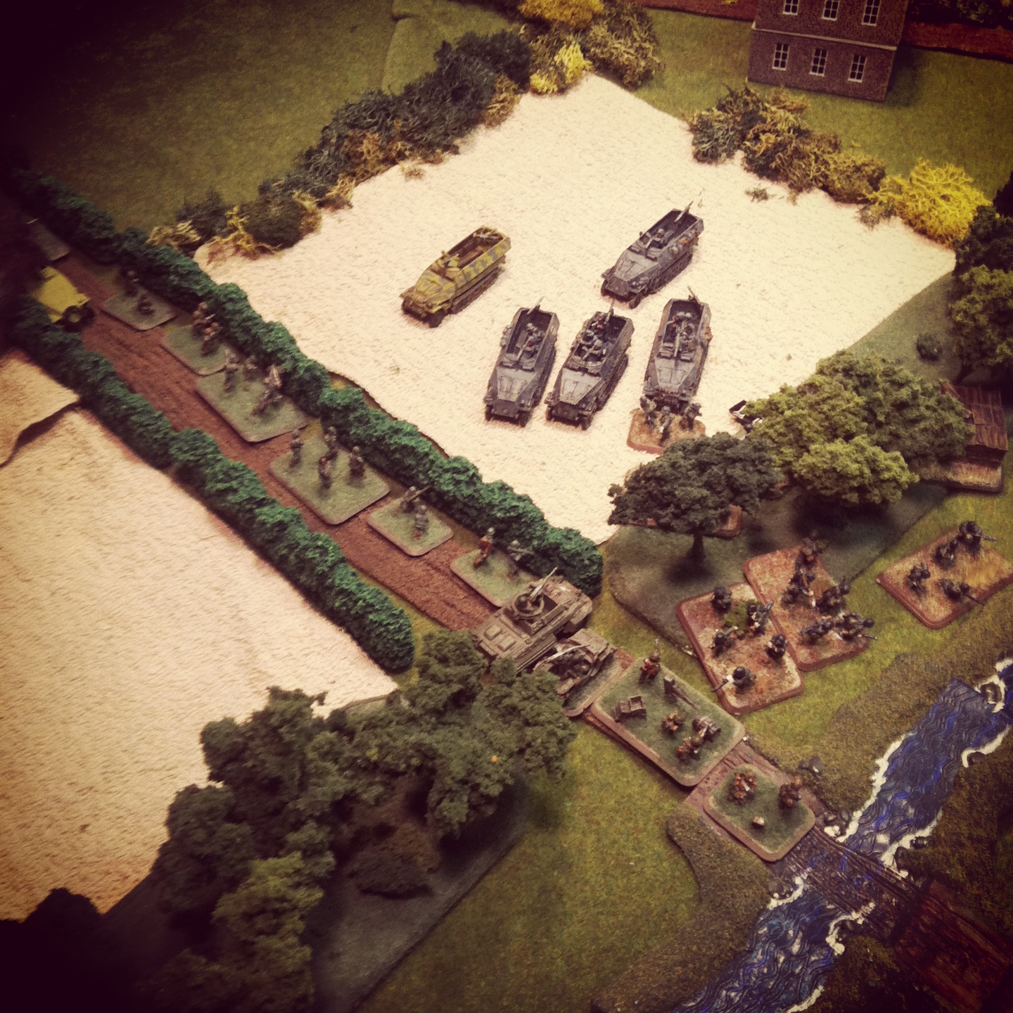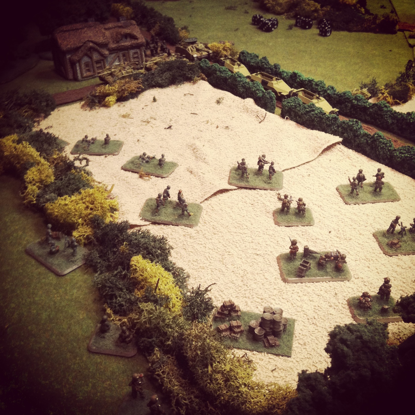 My game on the Western Front featured a generic French landscape cut up into winding narrow roads lined with the notoriously difficult bocage hedgerows which stymied both sides in the engagements fought in the region throughout 1944 and 1945. A church stared across the board to a stone bridge crossing a narrow stream to a small village. On the other end of the table, a small farm was set beside two wheatfields with two more rural stone houses in the near distance.