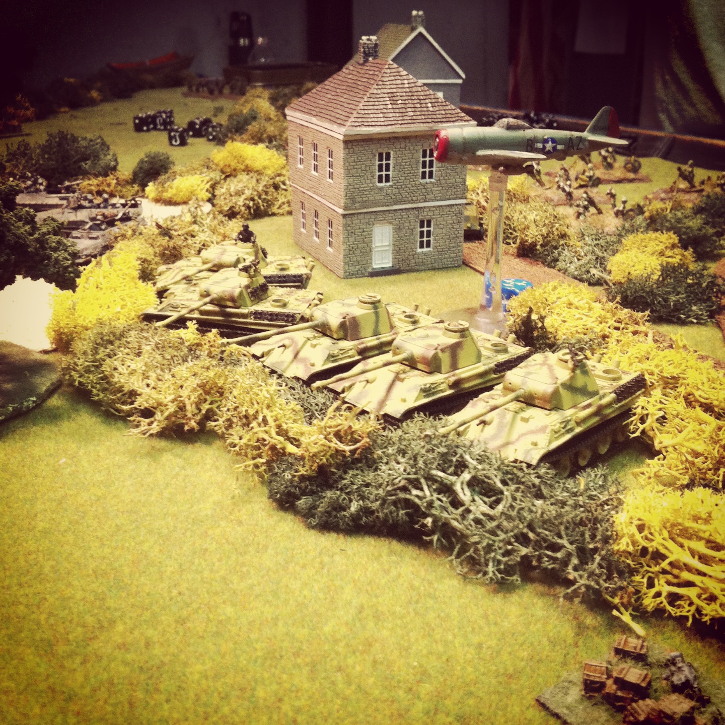 The game started poorly for the Americans as the Germans quickly pummeled the American Shermans and kept the infantry hiding in the woods. In the center, the US infantry struggled to occupy the buildings as the Germans quickly rolled five exceedingly threatening tanks behind a row of bocage overlooking two objectives. The American’s P7 Thunderbolt was likewise ineffective through the first few turns of the gaming, missing all targets except on German tank which burst into flames while bogged over a hedgerow.