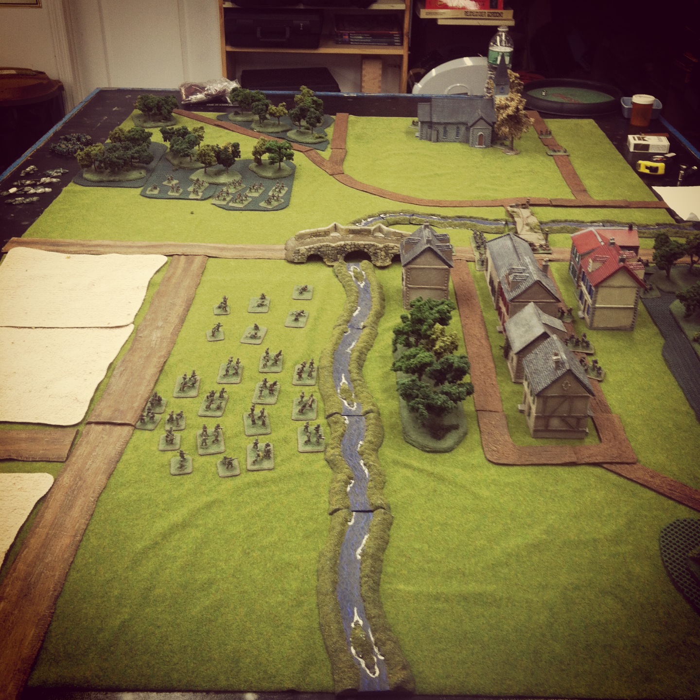 This past weekend at Metropolitan Wargamers in Brooklyn, NY we ran a modified Sint-Oedenrode scenario with the US 101st Airborne facing off against the German Fallschirmjägers. My paratroopers deployed in the fields and woods across the river with two rifle platoons and a light machine gun platoon. In reserve were US mortar and parachute howitzer platoons along with a delayed reserve Sherman and Firefly tank platoon from the Guards Armoured Division. The Germans started defending the two objectives at the bridges with a mortars, heavy machine guns and a rifle-machine gun platoon dug in around the town buildings.