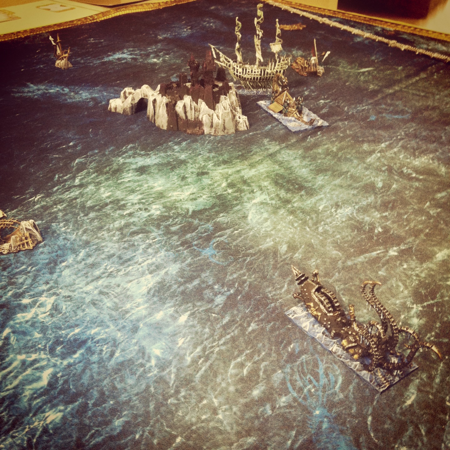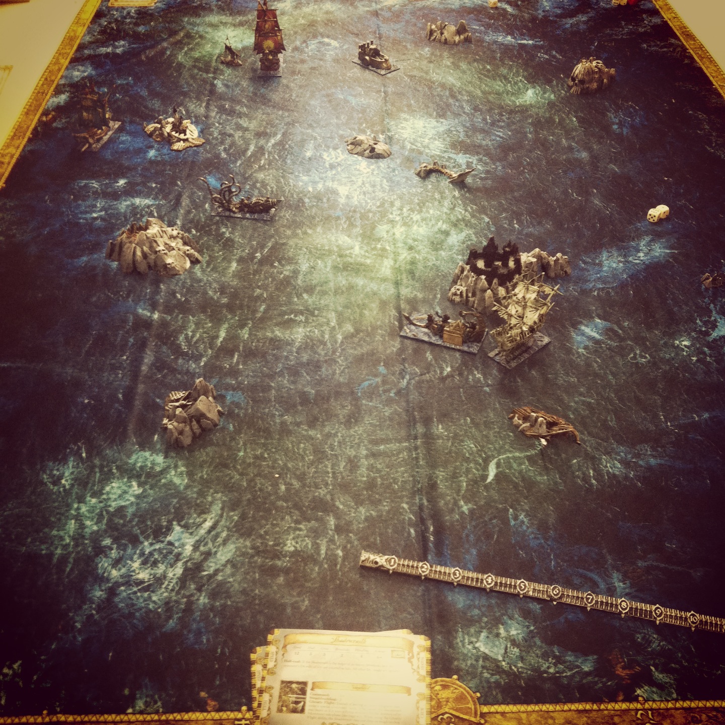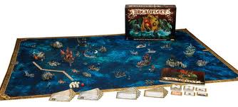 The limited-edition and now out-of-print Dreadfleet was met with mixed reviews when it was released a couple years ago. Set in the Warhammer Fantasy world with the Grand Alliance armada facing off against the undead Dreadfleet, the standalone game comes packed with incredibly intricate and delicate plastic models of ships, islands, sea monsters, treasure, ship wrecks and navigational pieces set on a beautiful printed cloth seascape playmat and accompanied by scores of cards.