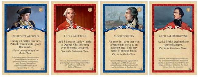 The action of the game is propelled by movement and event cards. Each player draws three cards to their hand and may play one movement and up to two event cards during their turn. Movement cards indicate one or more allied army’s movement from one to three spaces in a turn. Native American, Hessian and French forces cannot move until another force moves to their space and joins in alliance with them. Moving forces cannot move through enemy-occupied areas, and movement to a space containing enemy forces results in a battle.