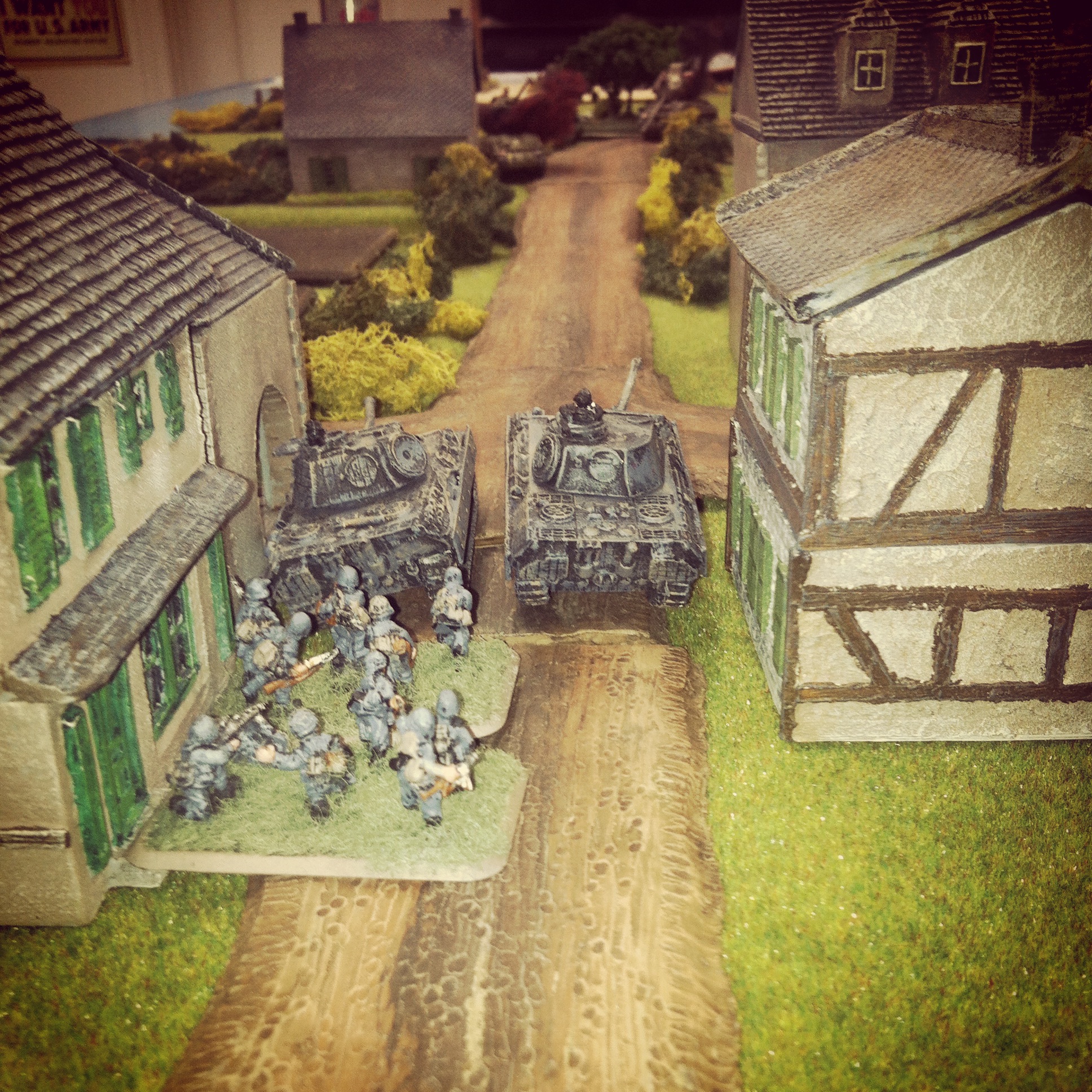 Even with all reserves on the table, the British attack was stumped. With one rifle platoon destroyed and a second whittled down, the British had just one intact infantry platoon on the field. One tank platoon struggled through the fields to one side of town, while the second sat idling on the road to town. Clear lines of fire around the church and town center presented open killing zones for the Germans in the town’s buidings and the three Panthers. All the Germans needed to do was sit in place and mow down the coming British.