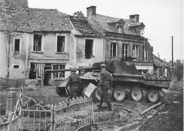 Panthers destroy a Firefly and the Sherman spotter tank at the edge of town
