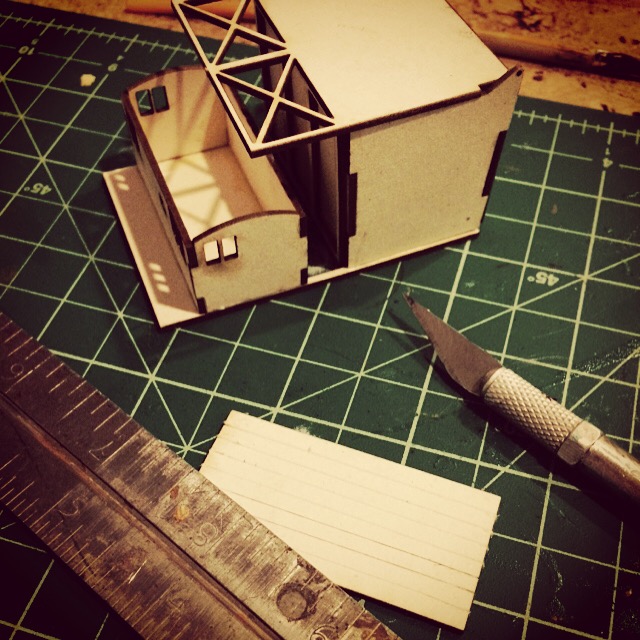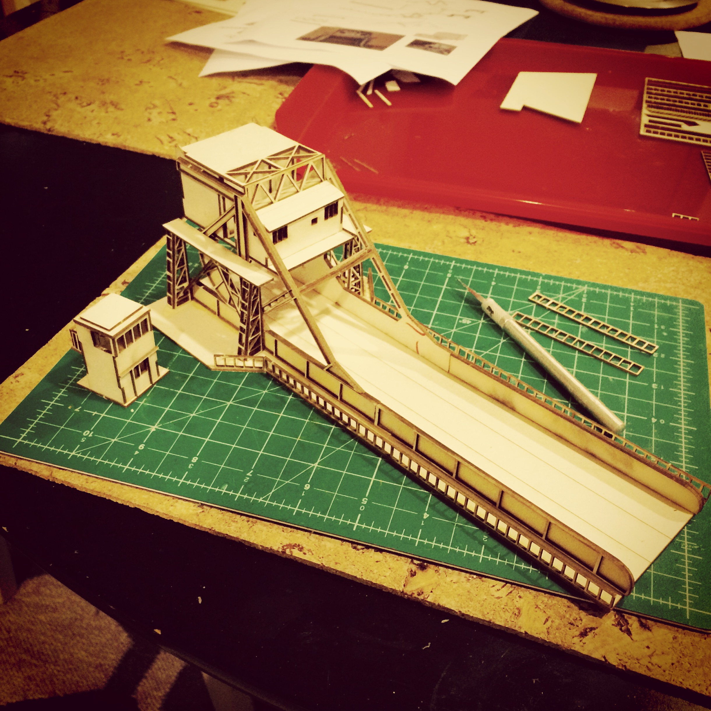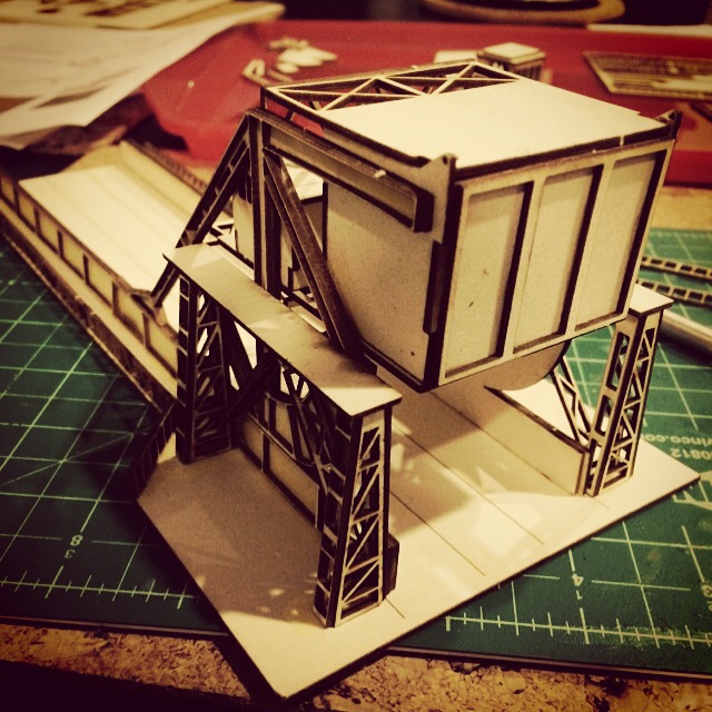 I started by laying out the parts into subsections, including the little control house which sits adjacent to the bridge and the two large sections which are found at the top of the bridge. I dry fit all the pieces to test them at first and then used carpenters wood glue to put the pieces together. Getting the stairs to the control house together was a little finicky. The curved roof on the small structure at the top of the bridge was achieved by scoring the flat roof and carefully bending it to the shape of the arched roof line.