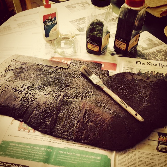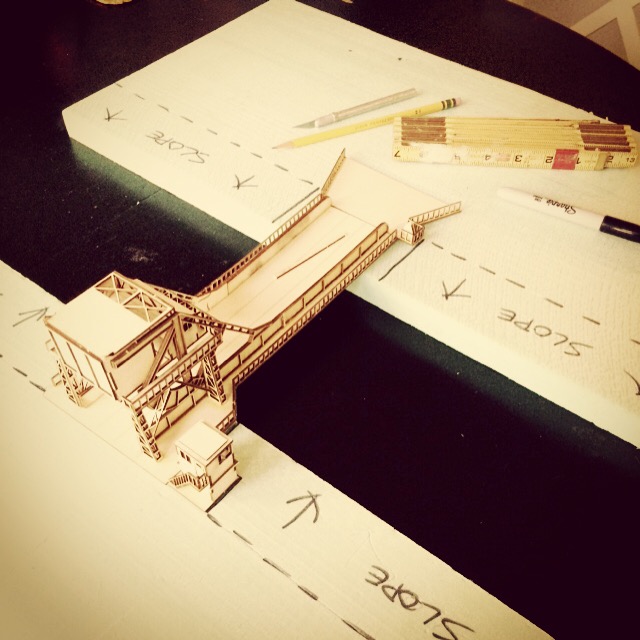 As I was constructing the bridge I quickly realized it was going to need to be elevated off the table to accommodate the graded approach and a span over the canal. I went to the trusty standby of foam sheets in order to create sections of terrain on either side of the canal to create roads to the bridge and banks of the canal.