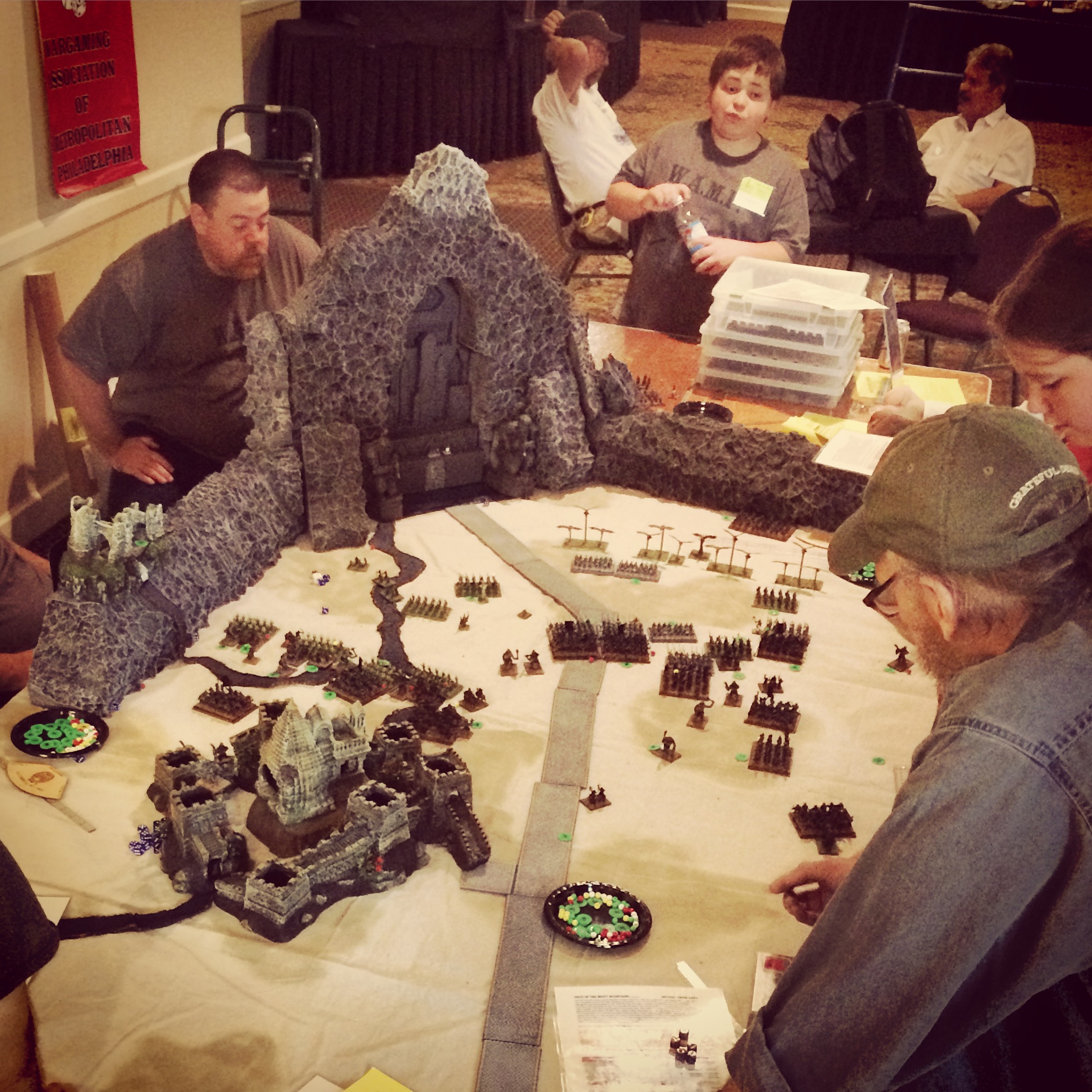 By dinner time I was back to touring the floor and checking out the late day games. I played a World War II naval battle run by a club member a couple other players new to the rules and battles at sea. An amazing American Civil War “Naval Battle of Memphis, June 6, 1862” ironclad game raged in the middle of the central convention room. Other periods were well-represented, including WWII, WWI trench warfare, a Haitian slave revolt scenario, ships at sail, a beautiful Lord of The Rings game, numerous games set in the Middle East, ancient warfare and the healthiest selection of French and Indian War and American War of Independence games that I had seen in many years.