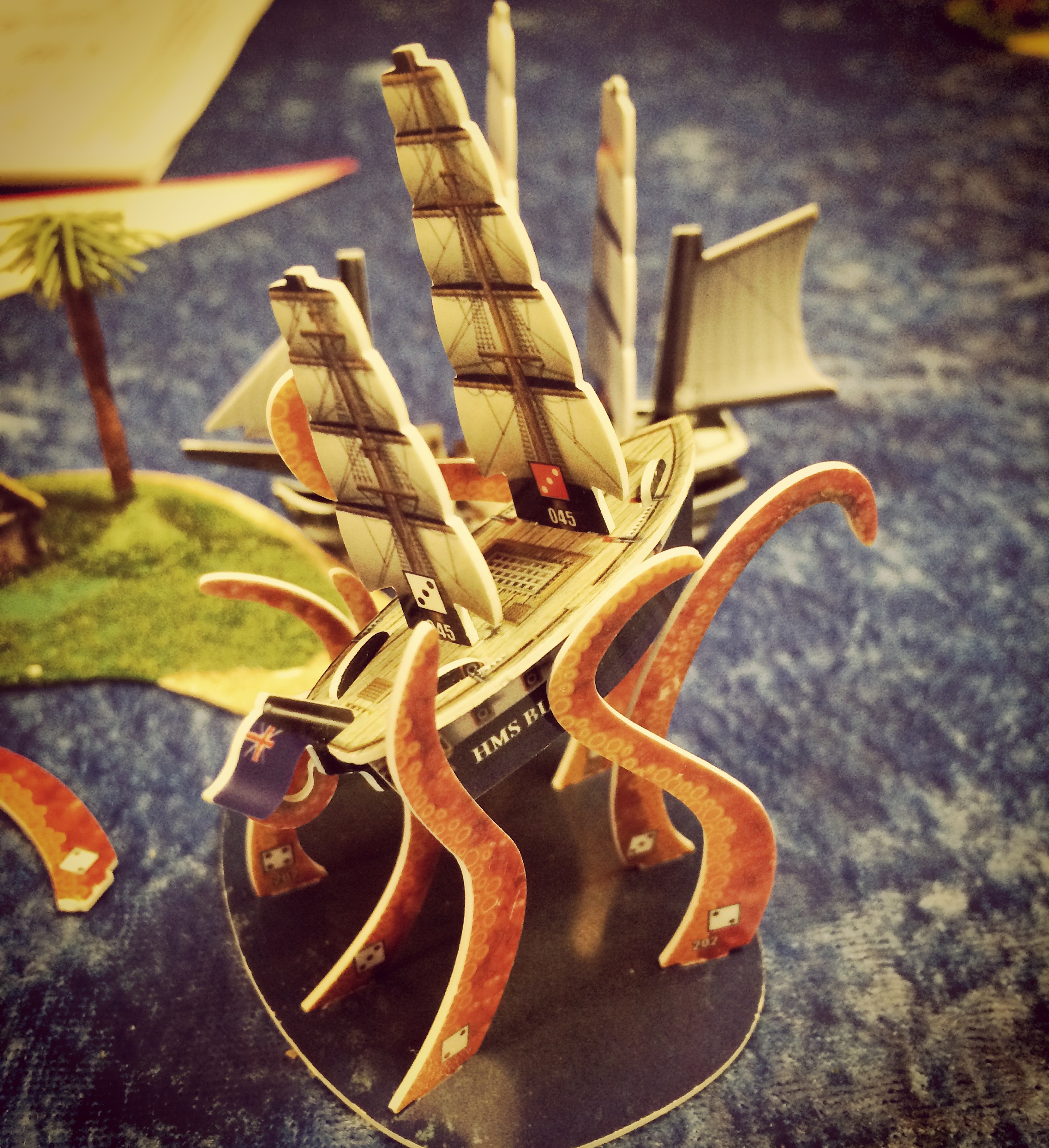 Just before heading off to grab another game, I won a couple small French and Indian War hex-and-counter games in the Toys For Tots charity raffle, feeding my current fascination with the 18th-century American colonial wars period. I wrapped up a long Friday of driving and gaming with a late night game of Pirates of The Caribbean using out-of-print plastic card miniatures from Pocketmodels and more home-brewed rules from my brother. The game has become a tradition for us on convention Fridays, and with the Jolly Roger flying on the wall nearby I managed to win the game for the first time in all my years playing.