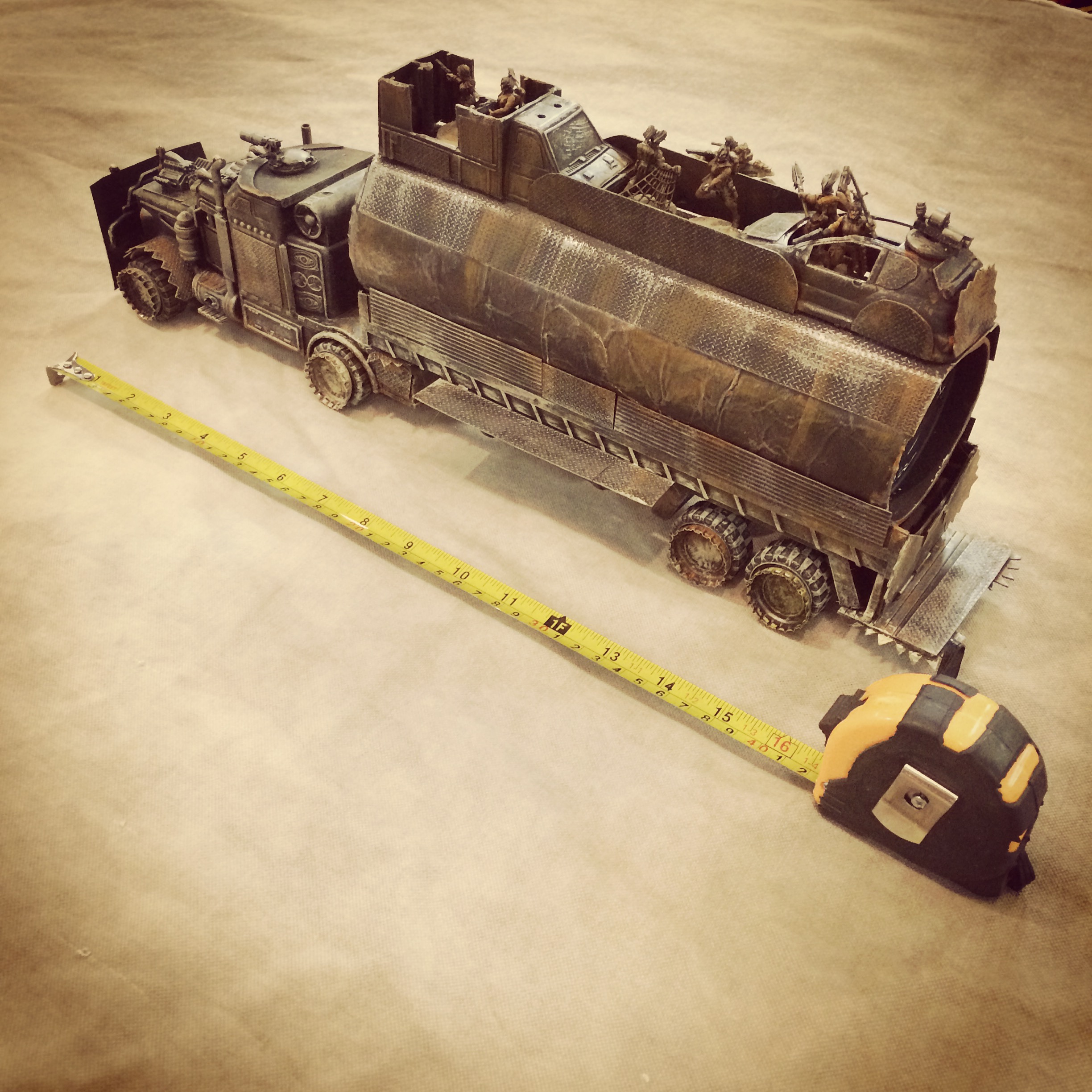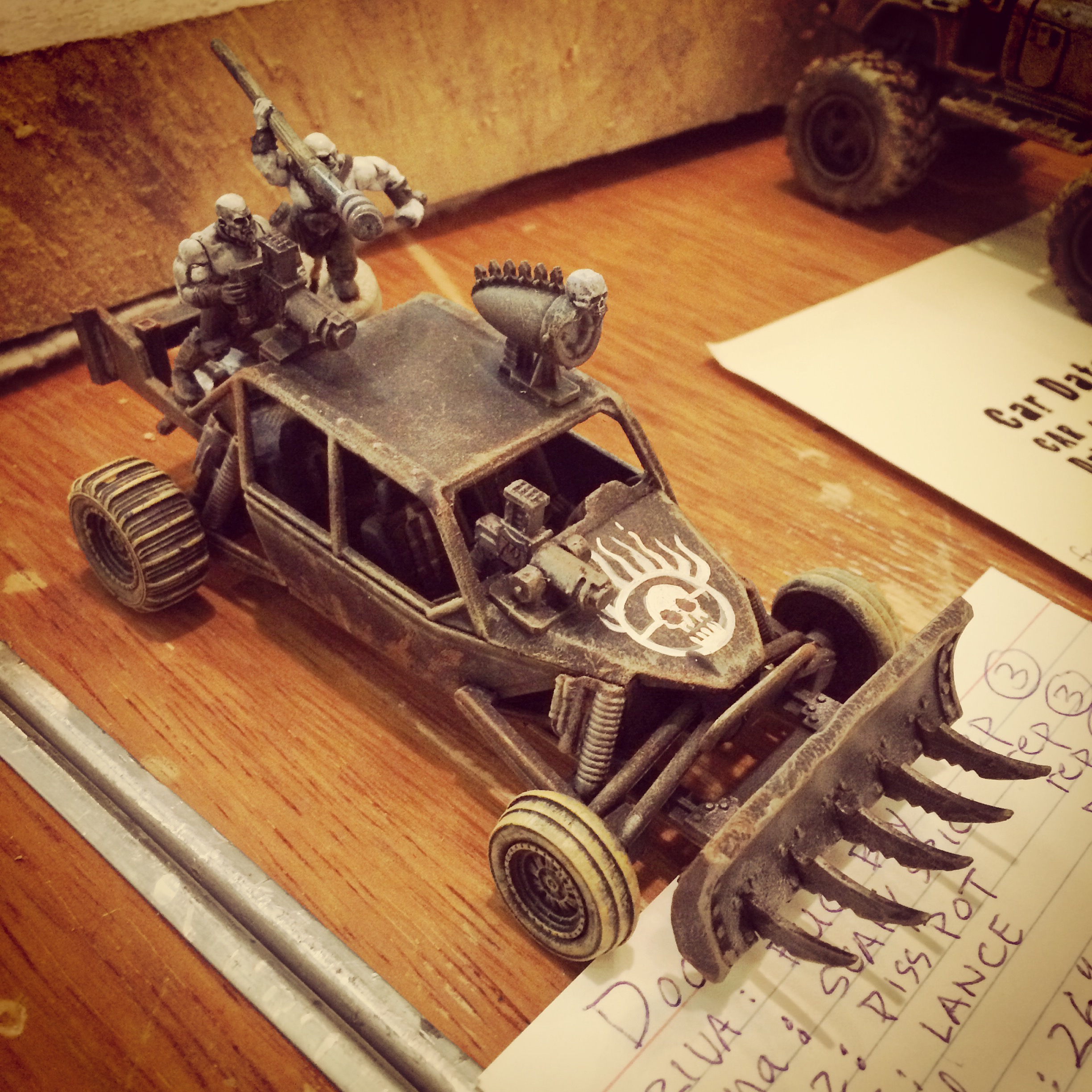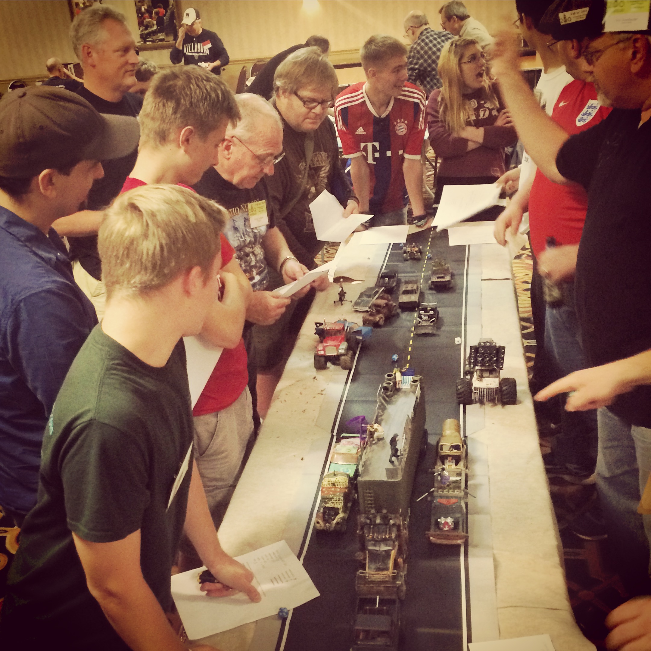 A number of sci-fi games were played throughout the weekend, including Star Wars, Star Trek and Battlestar Galactica games as well as some Warhammer 40K and BattleTech games. In the post-apocalyptic genre, zombie games were still present but not as much as in past years. The more recently popular Mad Max car dueling games are really coming on strong, made popular a couple years ago by the free Road Warrior/White Line Fever rules and modded Matchbox cars. Saturday night had two rowdy games of blacktop warfare — “Oh, What a Lovely Day” and “Road Warrior Invitational” — each featuring larger scale cars and trucks tricked-out with all manner of deadly weaponry and modified home rules.