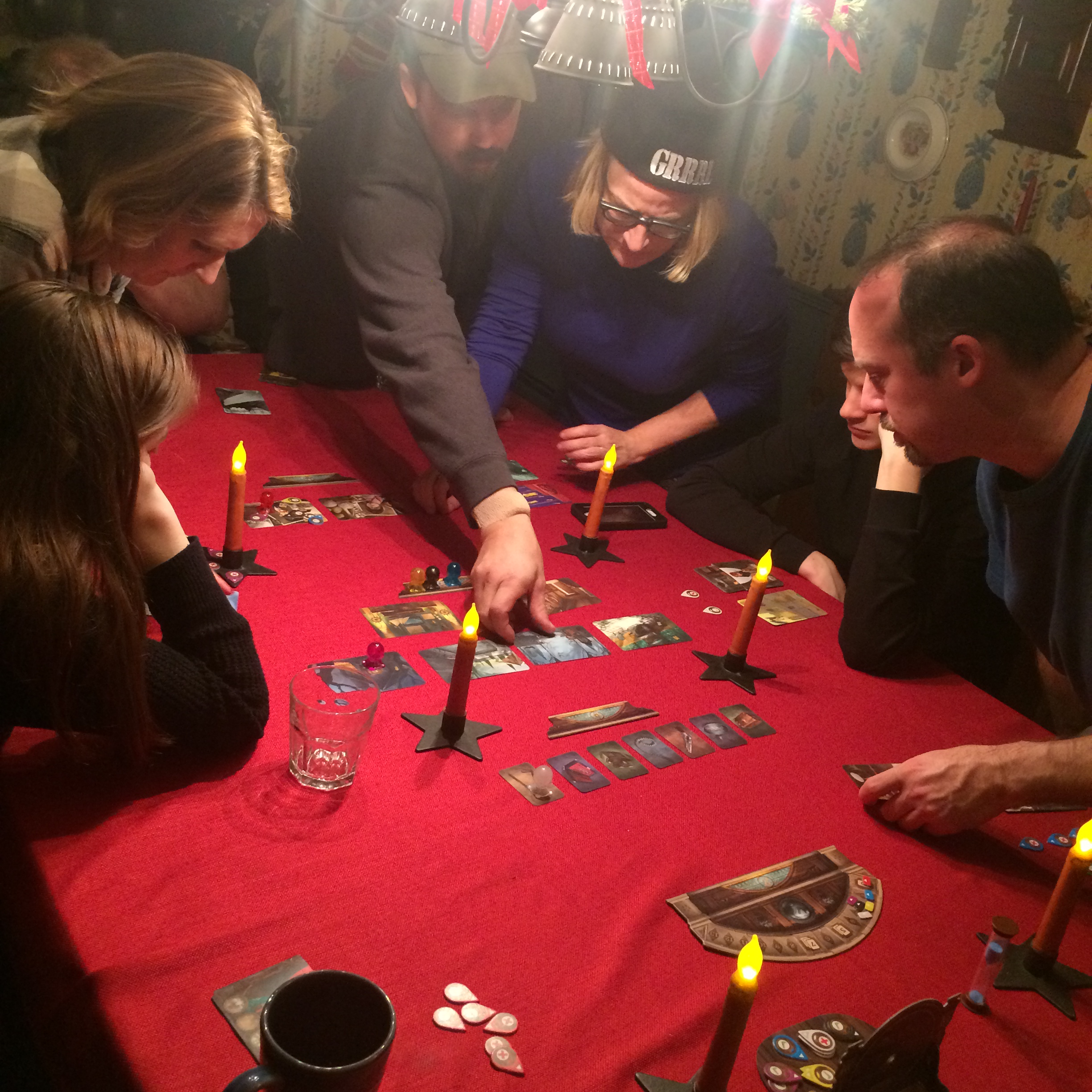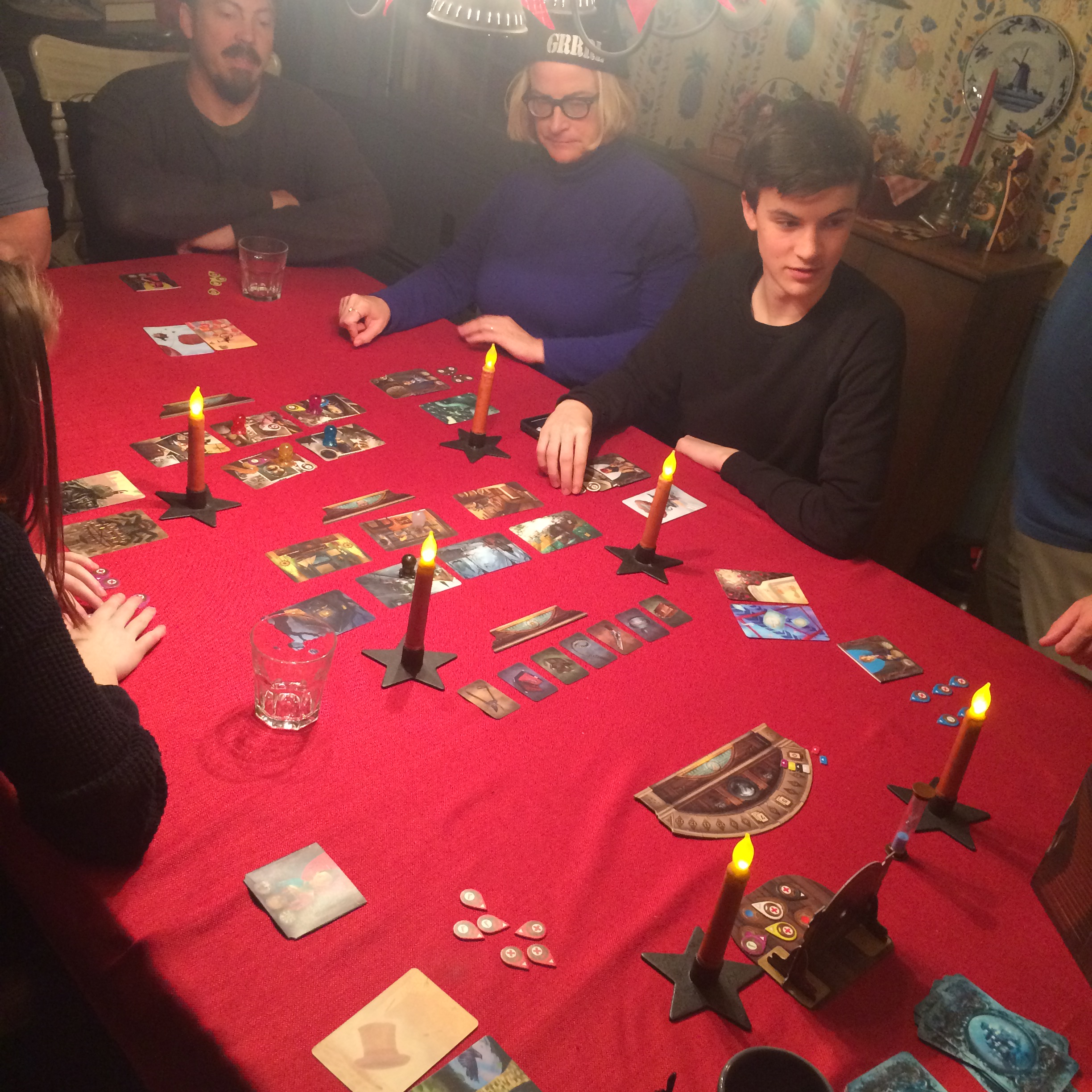 The recent English version of the game I picked up ahead of the holidays contains a lot of revised artwork and playing pieces (including a nice screen for the ghost and nifty clock turn counter) compared to the more spare European versions of the game. The design is beautiful and the abstract vision, suspect, location and weapon cards are a feast for the eyes. To mix things up a bit, we played a few games using cards from Dixit (also from Asmodee) as vision cards since the abstract illustrations fit nicely with the game. Playing the game on a table laid with a red cloth and some electrified candles also added to the séance setting for the game, and I could imagine it being a great theme game for a party or around Halloween.