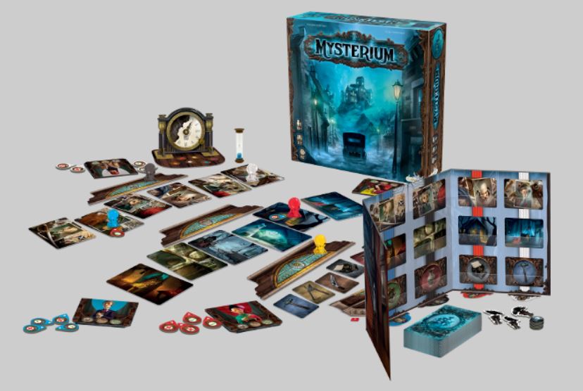Unlike Clue, Mysterium is a collaborative game for 2-7 players. In the game, a new owner of a mansion has hired a group of mediums to work with a friendly ghost in the house to solve an old murder mystery in a seven-hour overnight séance. One player works as the ghost along with the other players as mediums to uncover the suspect, location and weapon used in the murder. The ghost knows how to solve the mystery but may only communicate with the mediums in each hour (turn) through abstract dream or ‘vision’ cards, attempting to point each clairvoyant toward the solution. After each hour, the ghost reveals to each clairvoyant if they have found their suspect, location and weapon. Those that have solved a piece of the mystery move onward and those who have not remain to try again in the next round. If all mediums uncover their individual three-part combination before the seventh hour arrives, a final round of dream clues are delivered to all the players to vote for the final solution. If the majority select the correct final suspect, location and weapon, everyone wins. If the group doesn’t choose the correct combination, everyone loses.
