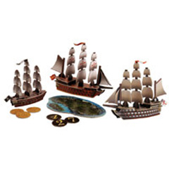 Just over 20 years later, WizKids introduced the Pirates of the Spanish Main constructable miniatures game. This still-popular game consists of collectible packs of ships in plastic credit card-sized punch-out packs. Each pack contains a whole game with a couple ships, rules, islands and playing tokens. The system went through a number of expansions with additional ships from varying eras and nations along with special island island fortesses and even sea monsters. Along with the movie series, a Pirates of the Caribbean series was also released with the ships, characters and story pulled right from the films. The ships looked fantastic although proved to be a bit brittle during gameplay which involved trade, combat and double-crossing across an open tabletop board. Although the game was officially shuttered in 2008, a huge secondary market continues for unopened packs of game cards.