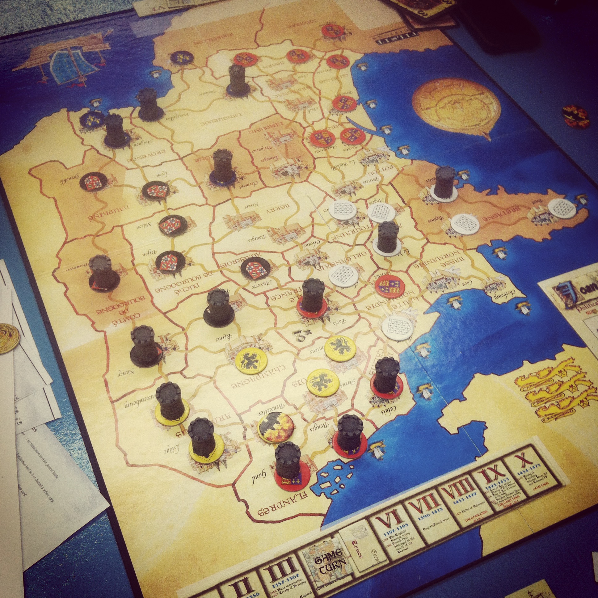 Released by Clash of Arms in 1998, Joan of Arc is at this point a classic board game which I recently had a chance to play for the first time at Metropolitan Wargamers in Brooklyn, NY. The game board presents the contested areas of the 100 Years War dotted with cities connected by roads. Players choose to represent on e of the warring kingdoms of France, England, Navarre, Brittany, Flanders and Burgundy. The game begins in a time of peace, and in each subsequent turn players vote in secret on whether the turn is to be one of peace or war. A time of peace causes one random event to be drawn and just one attack action per player, while a period of war brings two events and up to two battle actions from each player.