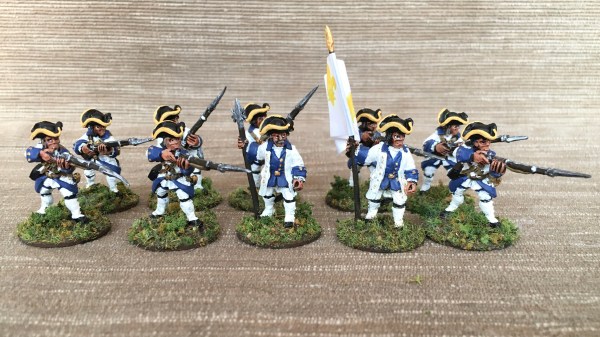 I am not generally a fan of painting white uniforms, but the blue waistcoats, lapels and cuffs, as well as the yellow-trimmed tricornes, provide a pretty stunningly graphic contrast. Once deployed, twenty of these French regulars on the table in a double-ranked firing line really present an imposing force as they must have in the many of the pivotal FIW battles in which they fought.