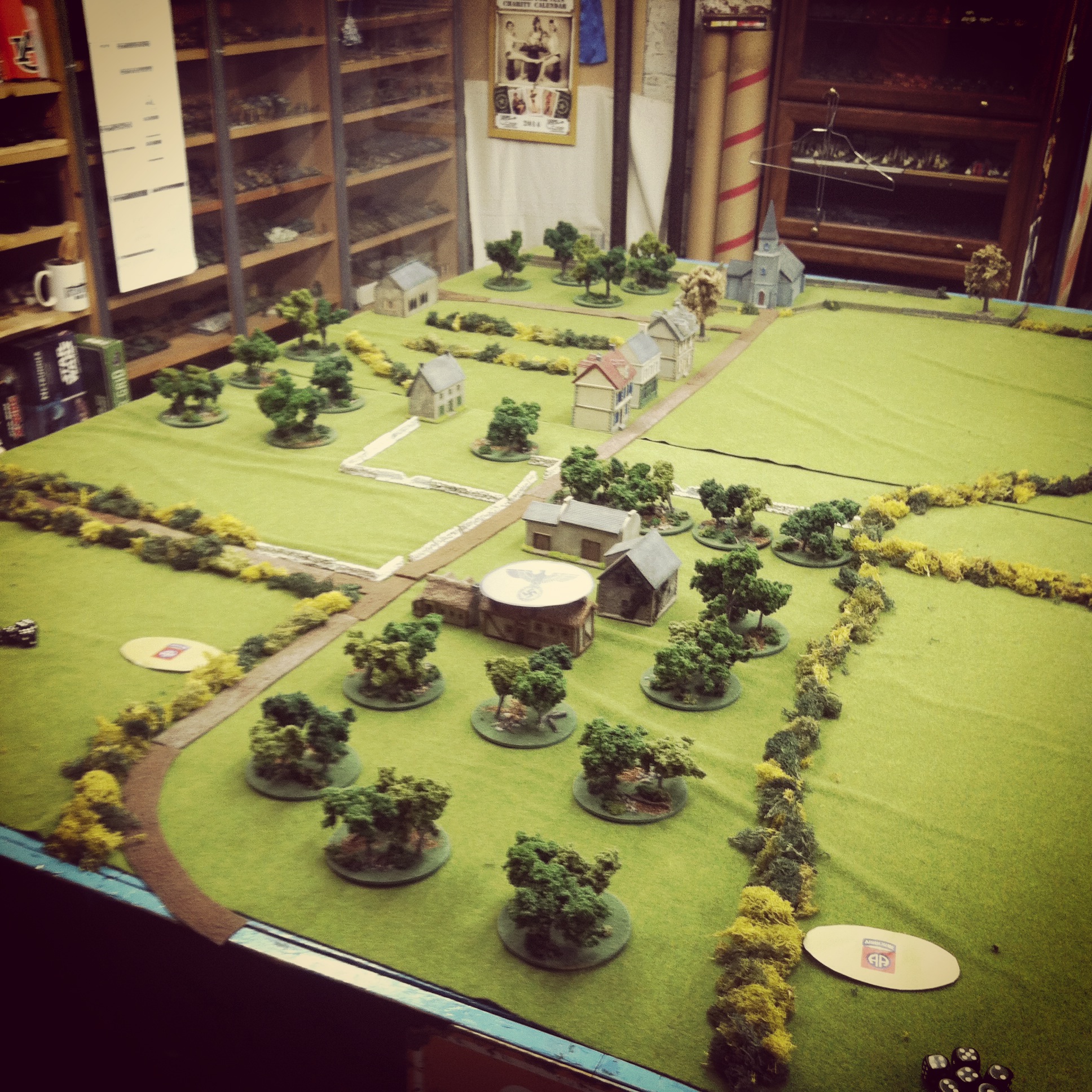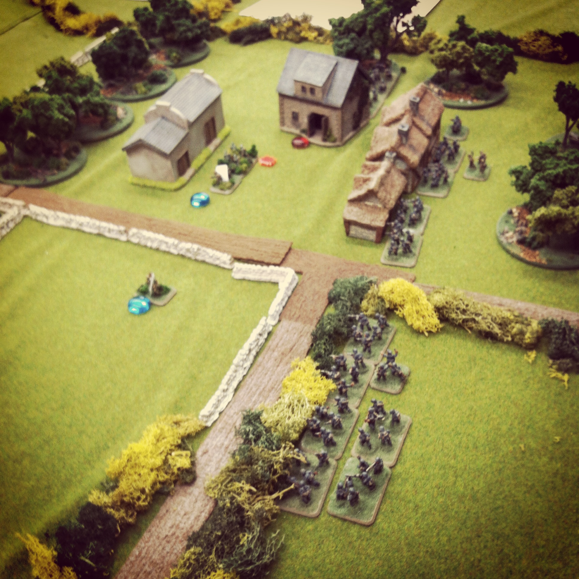 As per the scenario, initial Allied blinds approach a farm outside Vierville where a German blind sits unknowingly in the complex of buildings. With Allied infantry closing in over dense bocage hedgerows and orchards, a firefight erupted and drove the German defenders through the buildings and into the orchard beyond.