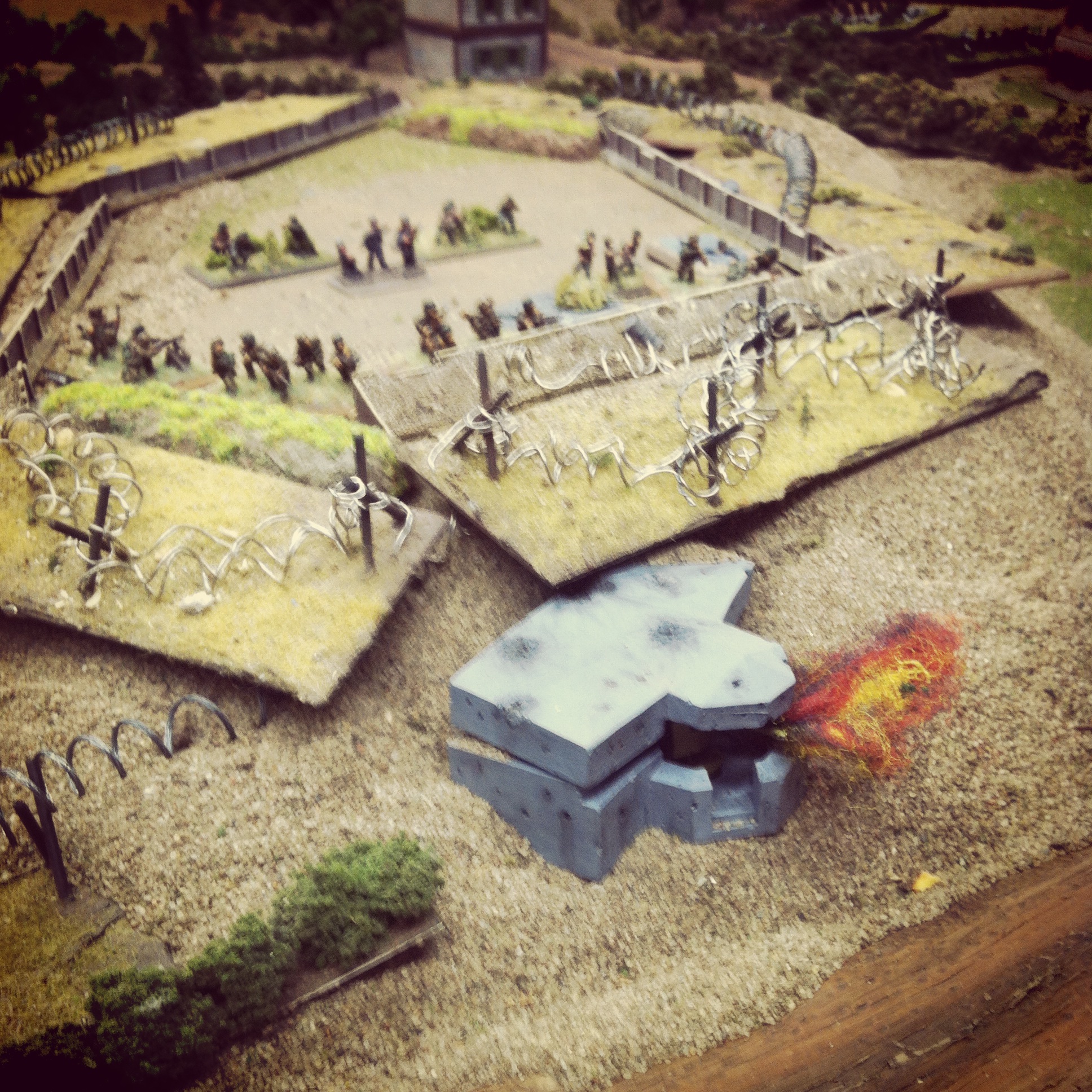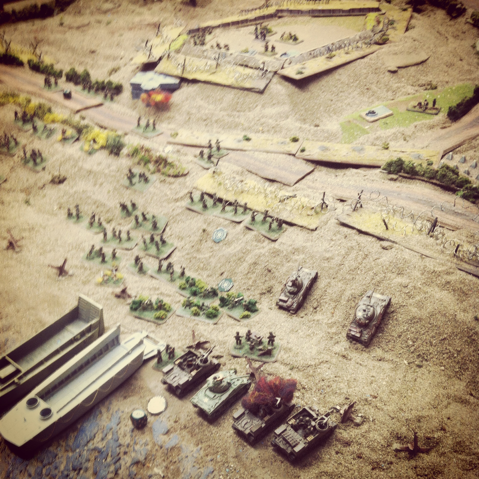 The opening turns found a lot of US boats on the beach and a quick push to the seawall. So early combined arms fire managed to destroy the main bunker at the beach, but the battle was far from over. The initial US push followed on to the left of the beach, but multiple turns at clearing the barbed wire stalled the advance as the Americans took heavy fire.