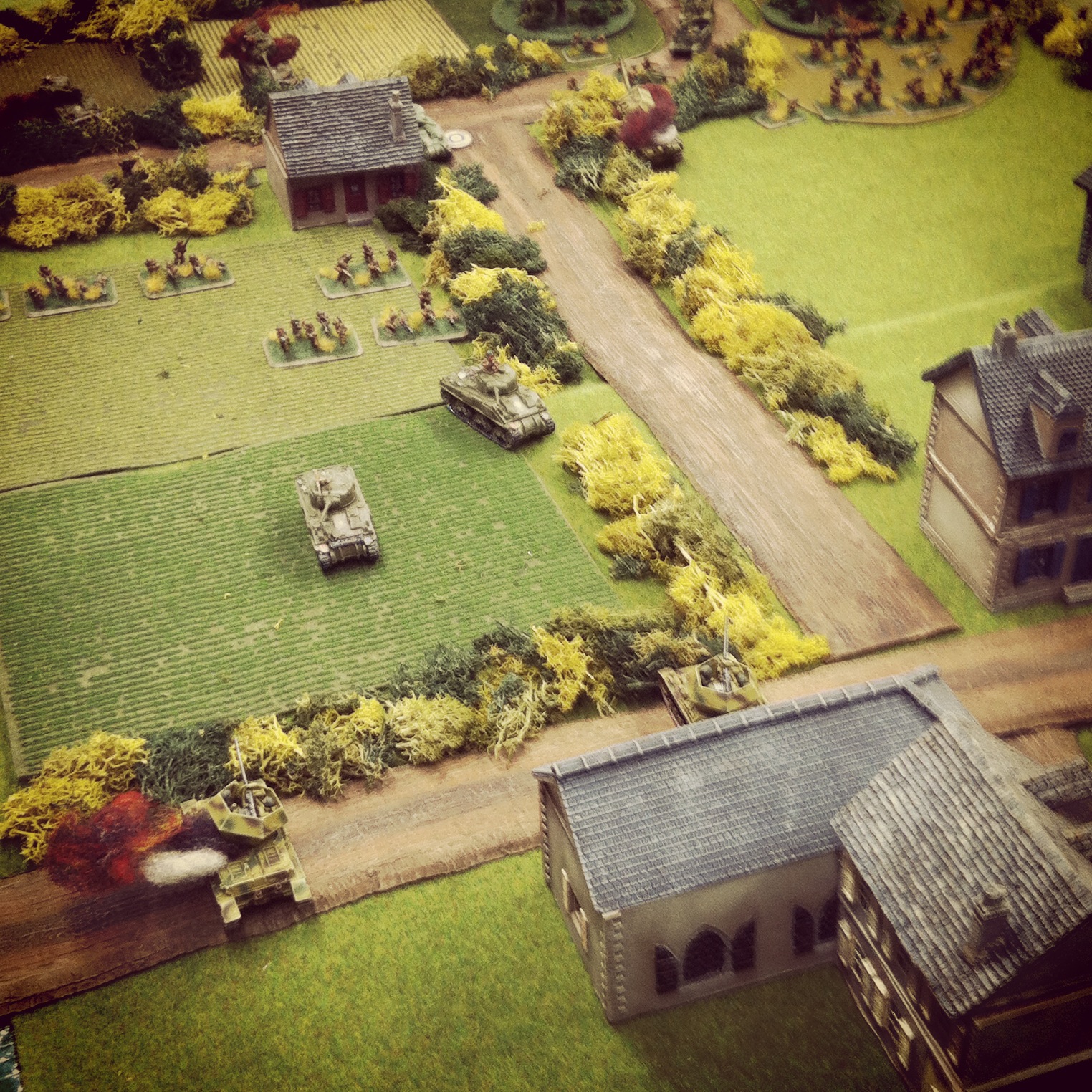 In the meantime, a multi-turn tank duel had settled in between a lone Firefly and Panther while a reinforcing Panzer IV platoon arrived at the edge of town. Both tank groups traded fire, and in the end, the Panzers were routed with two or their three destroyed and the Firefly fell to the Panther’s gun. Back at the farm field, Shermans traded fire with Pak 40s and destroyed an anti-aircraft platoon defending the town’s flank. With two Panthers left on either side of the church, Shermans on each side of town and advancing British infantry, we called the game a draw.