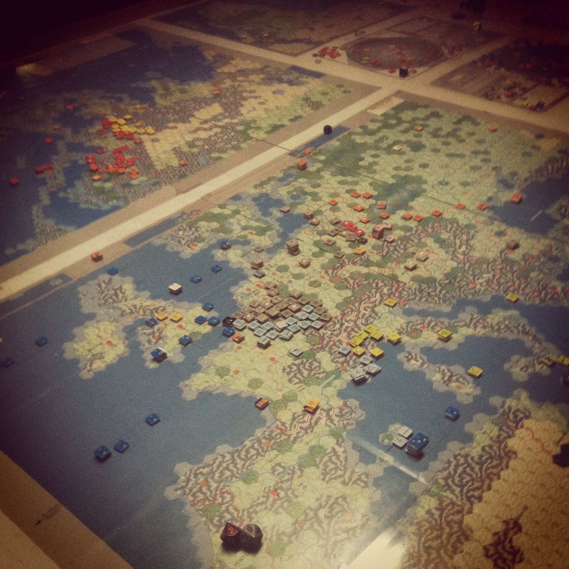 The Normandy ’44 game from the evening before concluded with a decisive Allied victory Saturday afternoon. Pushing the Germans back from all but Utah Beach, the Allies captured Bayeux and several smaller towns. With German defenders routed from roads leading inland from the landing beaches, the victors rolled in to control half of Caen by the game’s end.