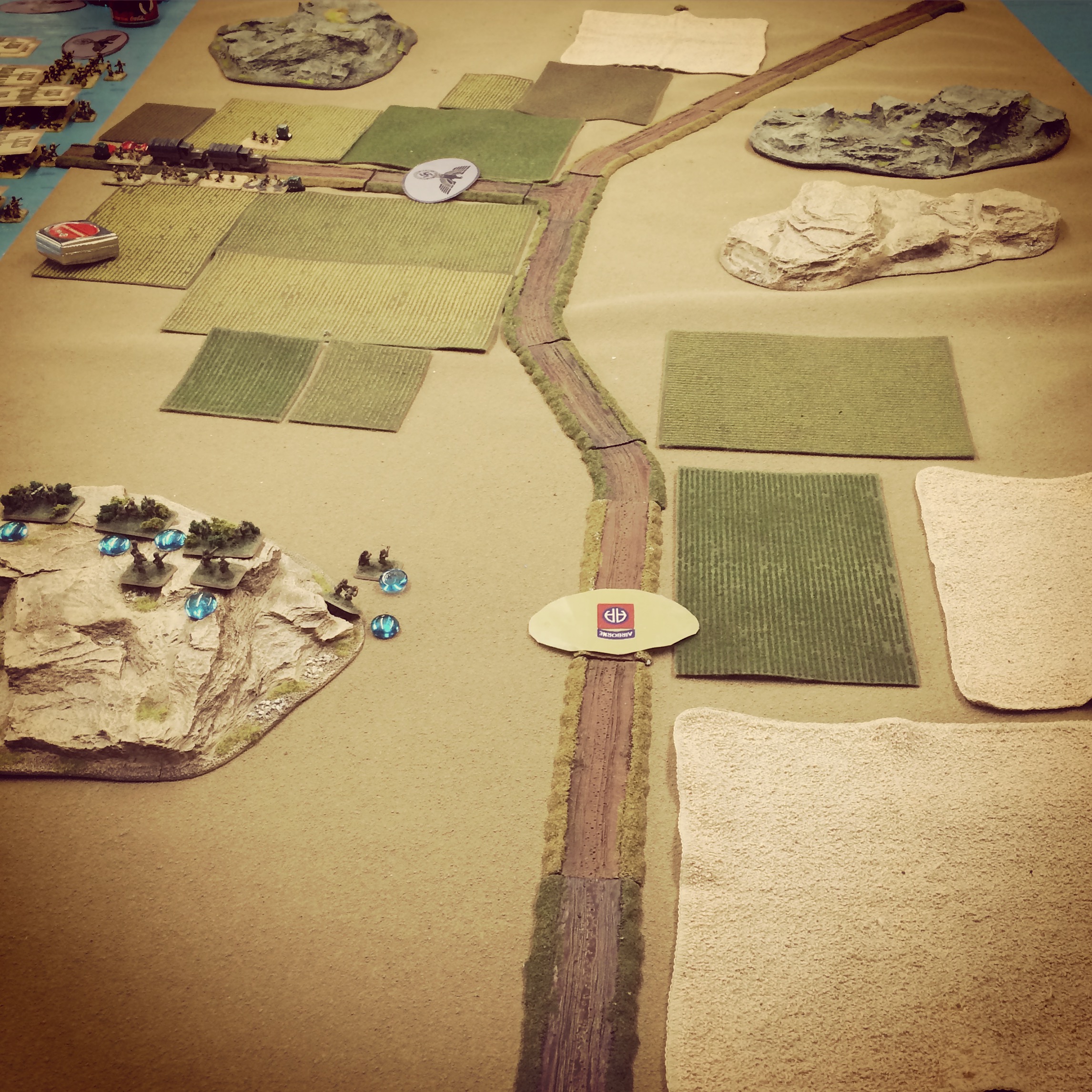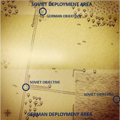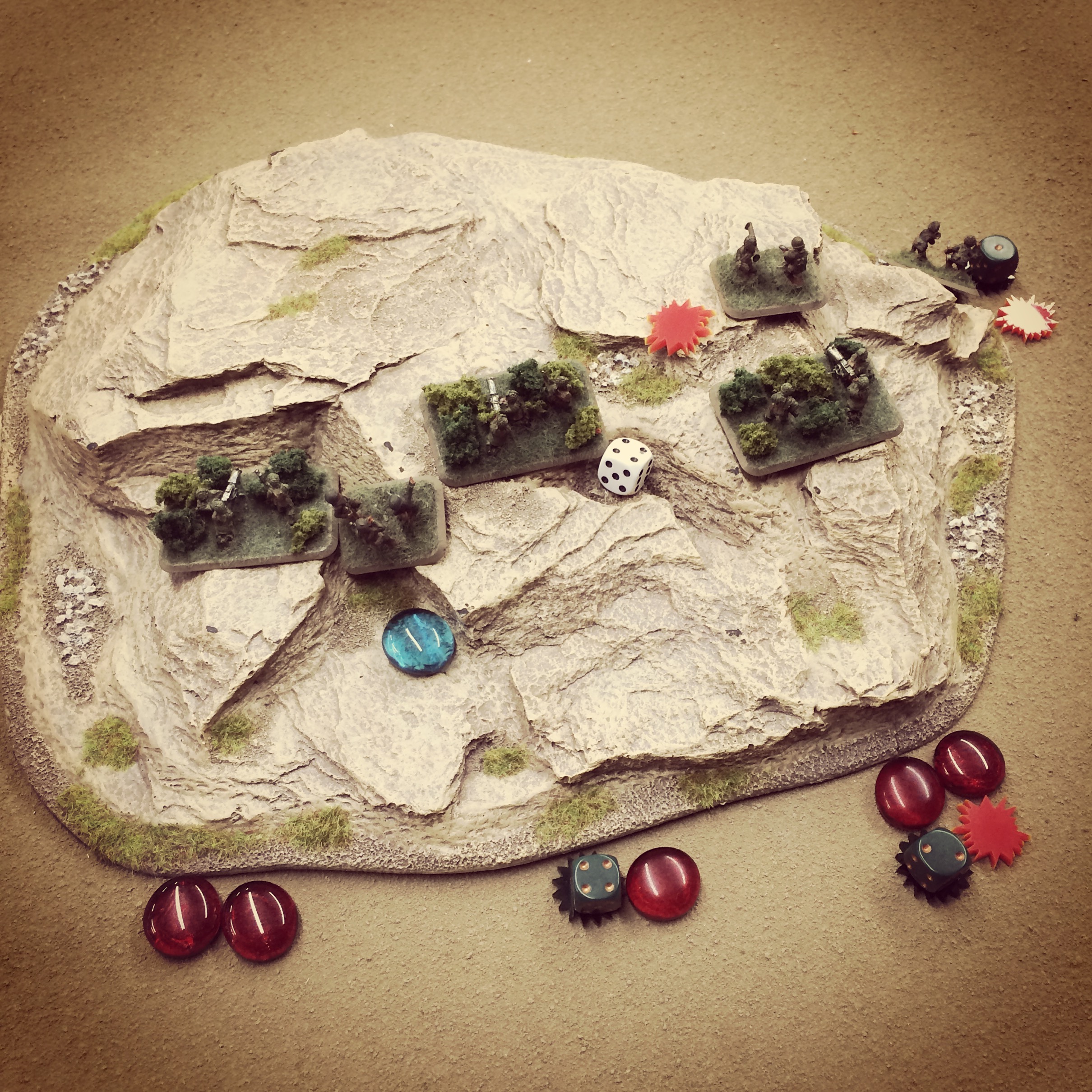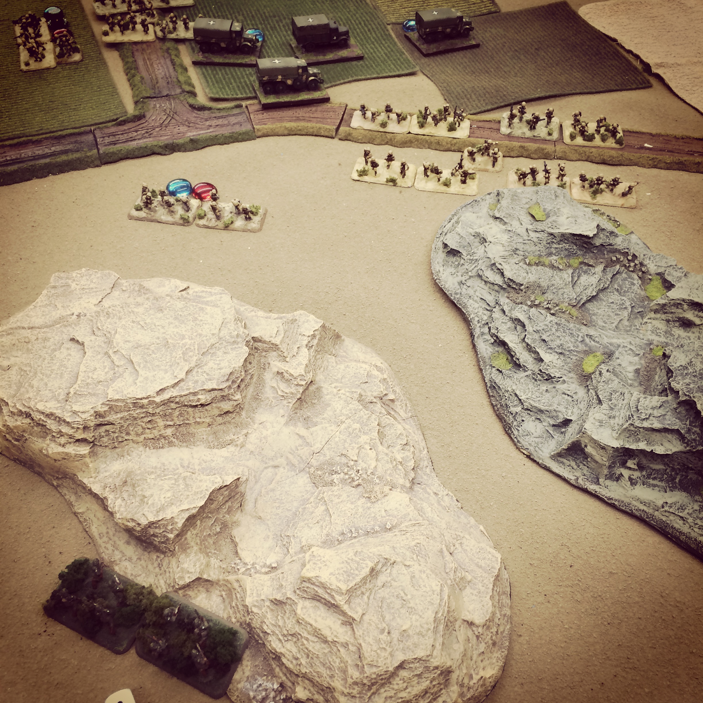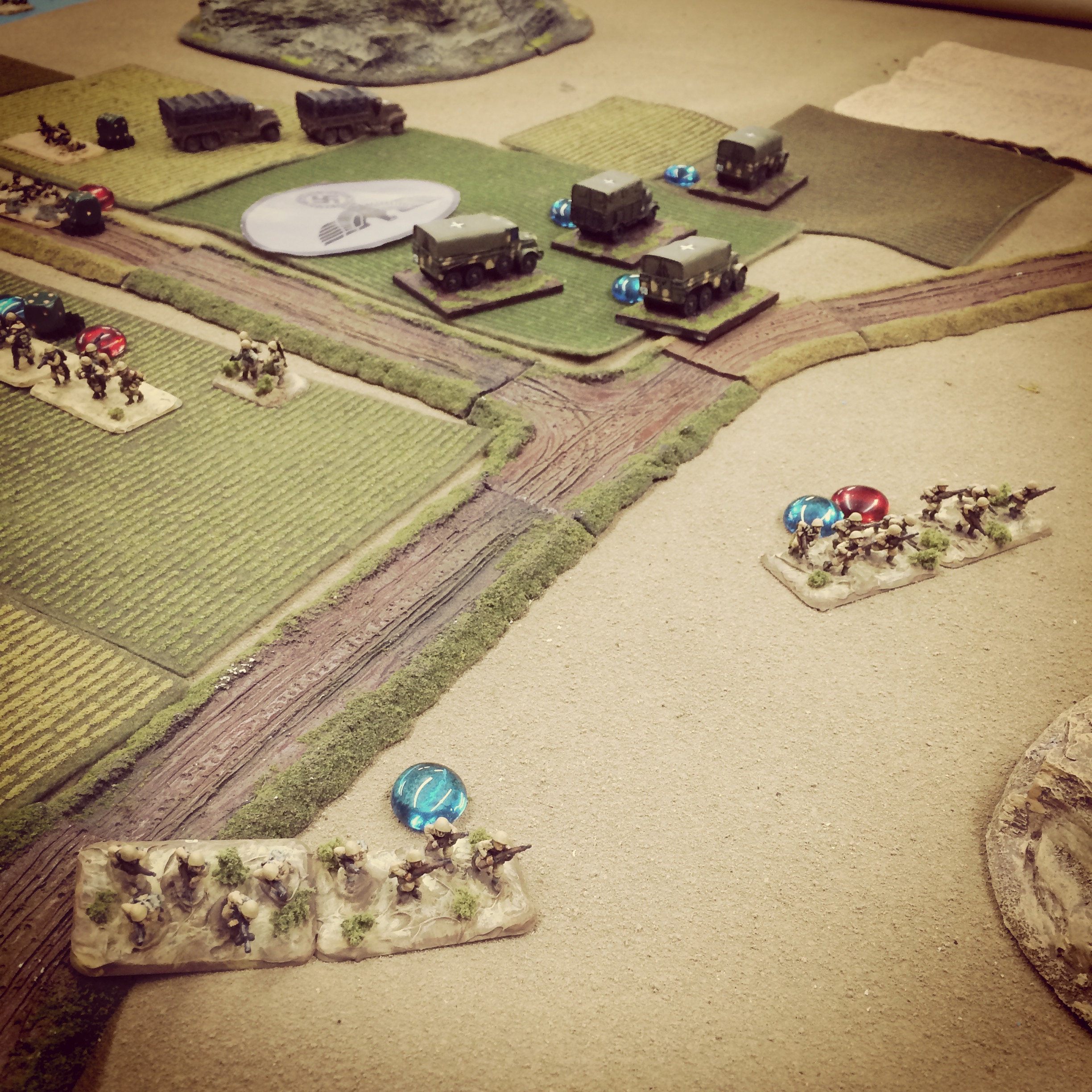 Like most IABSM games, the fight at the bridge started with hidden German troops and the British entering the board on blinds. Initial blind placements were randomized through a die roll to reflect the off-board glider landings. Owing to the time just past midnight, spotting of any troops was impossible until units closed with just inches of each other.