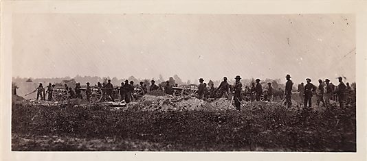 Titled “Pennsylvania Light Artillery, Battery B, Petersburg, Virginia,” O’Sullivan’s small photo (maybe 3″ x 9″) purports to give a rare glimpse of a full artillery battery either drilling or possibly in actual combat. The mass of guns, crew and equipment shows the full size and complexity an artillery section brought to the fields of the American Civil War 150 years ago.