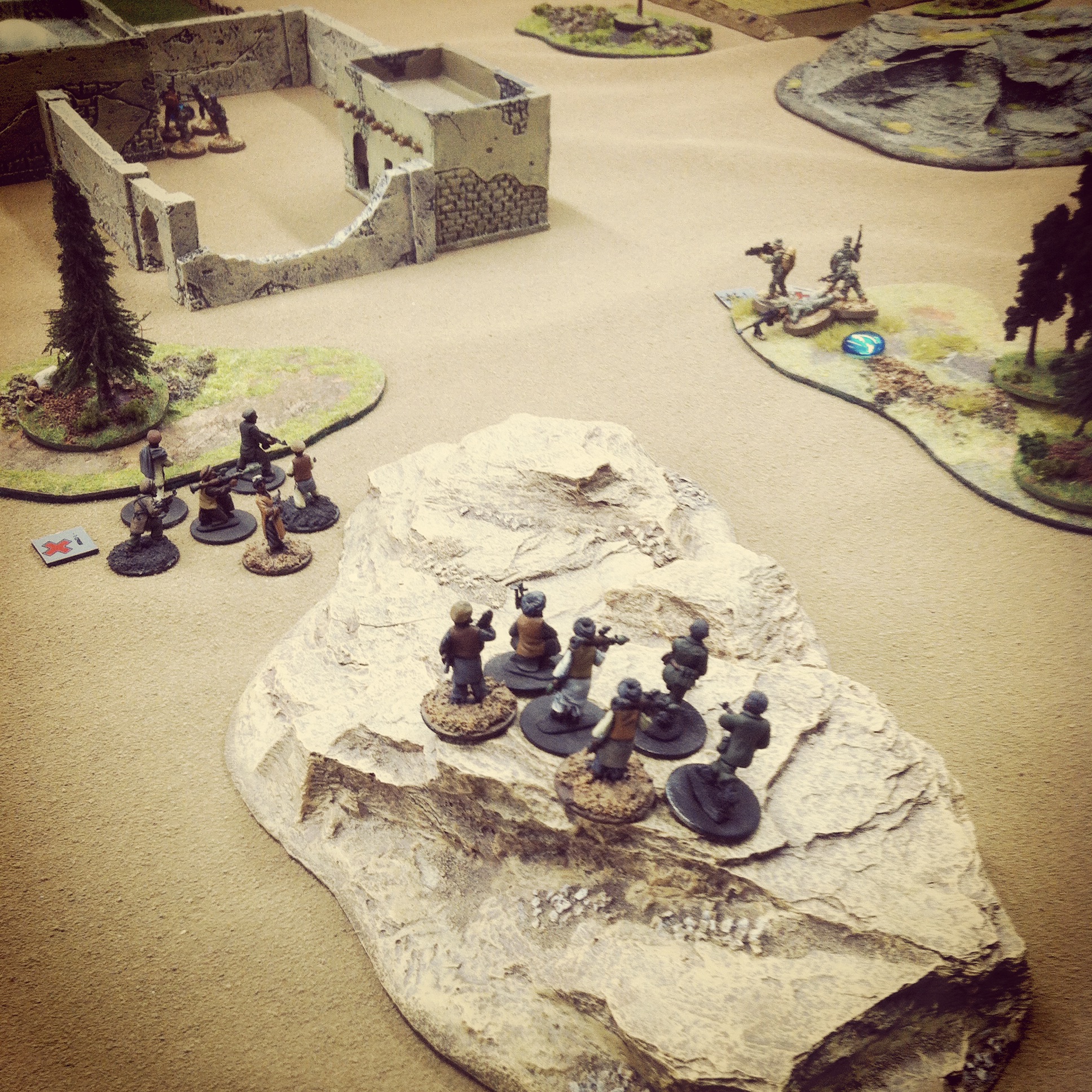 Several hours in, we called the game. The small-scale tactical nature of IABSM is highly contingent on when a platoon or command ‘big man’ card activates. With so many Italian cards in the deck, a run of activated Italian unit cards may have provided the push they needed to get to the main street and victory. That said, each US card drawn was continuing to have devastating results on the somewhat weaker Italians, causing casualties and flinging them into reconsidering different routes. The large number of Italian on the field were still poised to match up with the higher quality American troops, although the US had clearly blown an early opportunity to use their off-board artillery effectively. Good and bad command choices had left Gela contested for the day.