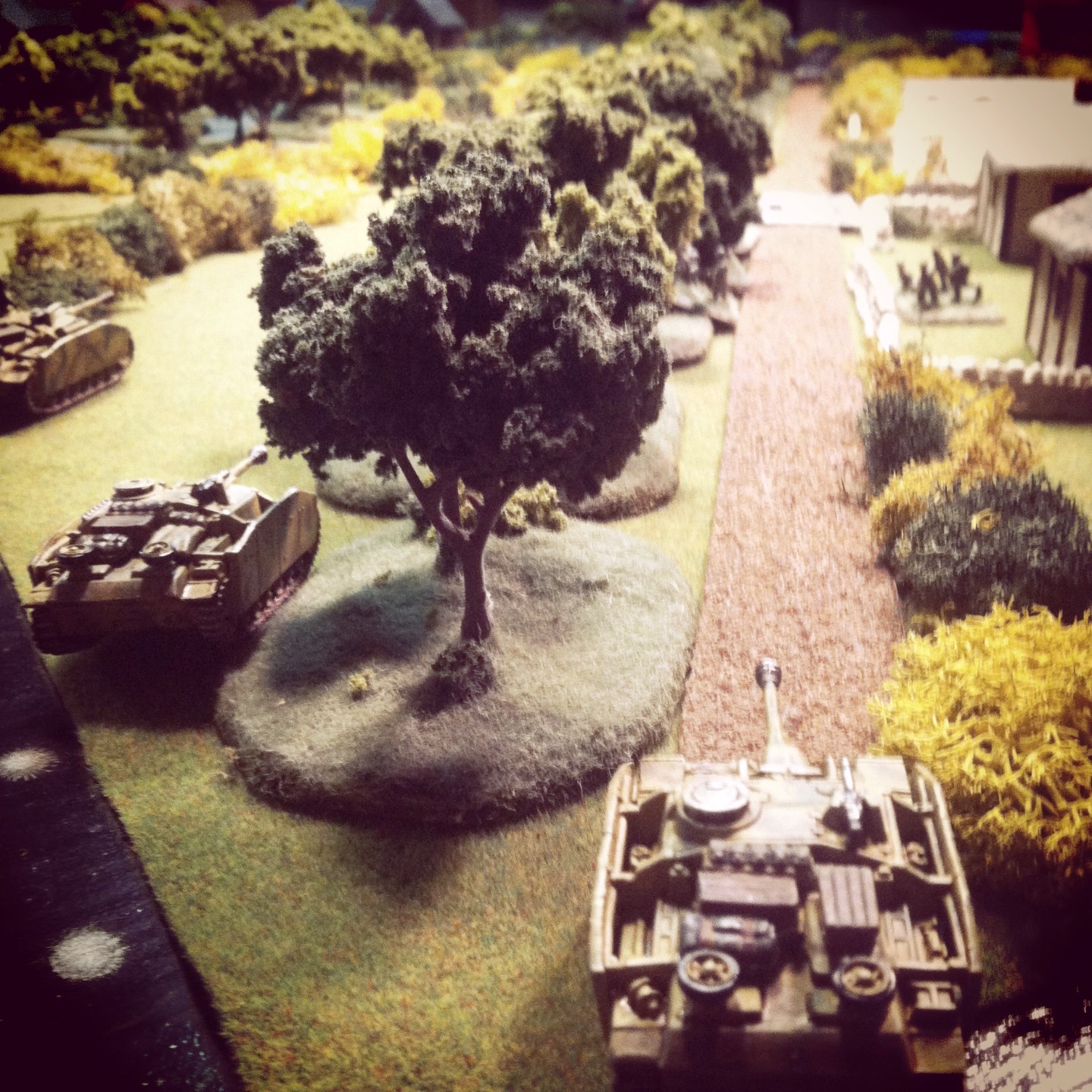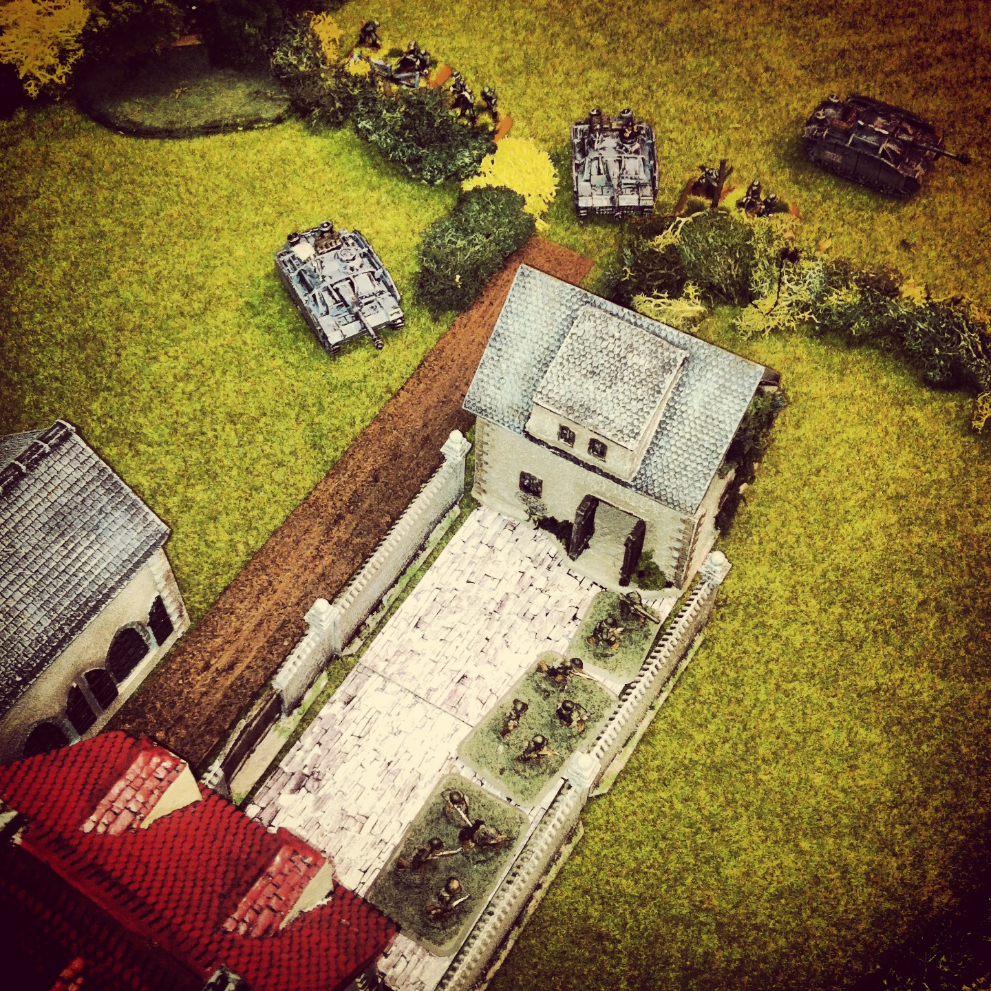 In the meantime, a multi-turn tank duel had settled in between a lone Firefly and Panther while a reinforcing Panzer IV platoon arrived at the edge of town. Both tank groups traded fire, and in the end, the Panzers were routed with two or their three destroyed and the Firefly fell to the Panther’s gun. Back at the farm field, Shermans traded fire with Pak 40s and destroyed an anti-aircraft platoon defending the town’s flank. With two Panthers left on either side of the church, Shermans on each side of town and advancing British infantry, we called the game a draw.
