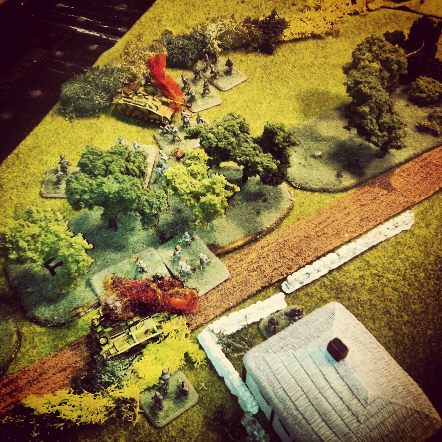 As per the scenario, initial Allied blinds approach a farm outside Vierville where a German blind sits unknowingly in the complex of buildings. With Allied infantry closing in over dense bocage hedgerows and orchards, a firefight erupted and drove the German defenders through the buildings and into the orchard beyond.