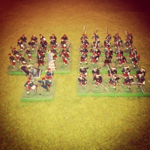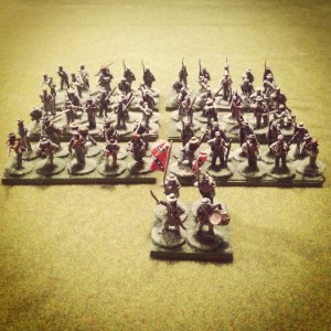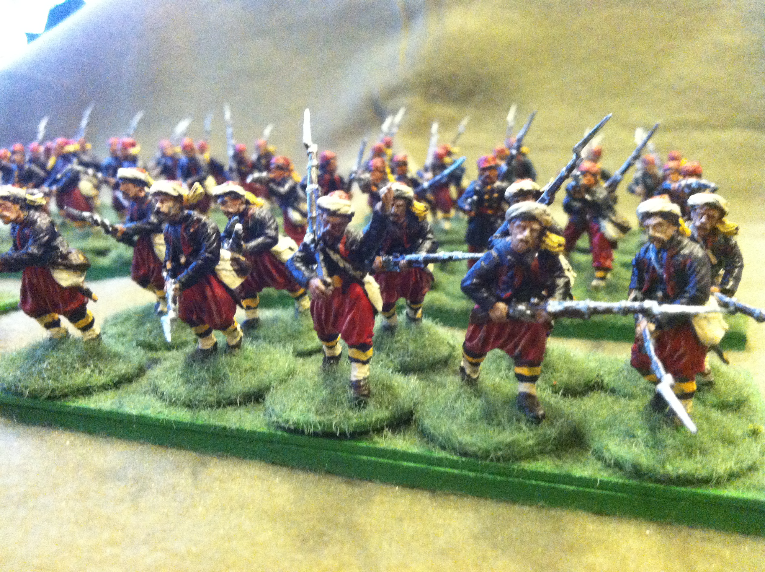I painted most of the company in their more common battlefield fez headgear, shown below in detail. These figures are the metal Perry Miniatures firing line, while the rest of the company are plastics.