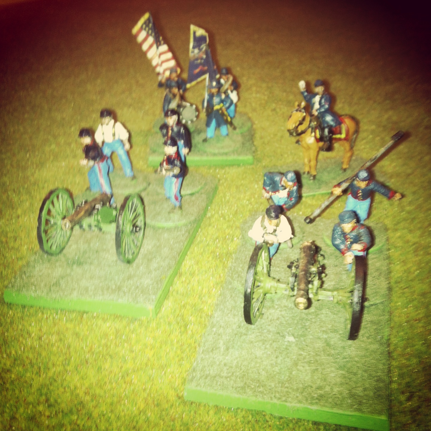 Without going into the details of assembly (relatively easy) and painting technique (also quite easy), I’ve got about 125 figures painted up now on each side. I’ve also completed some mounted and infantry command, artillery batteries and casualty figures. All figures are based on metal washers, and I also made some movement stands for each unit with magnetic sheets adhered to balsa bases.
