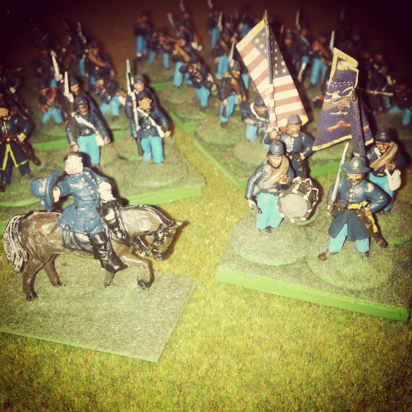 Below is an overview of my completed five squads from the 5th NY Volunteers along with their company command stand.