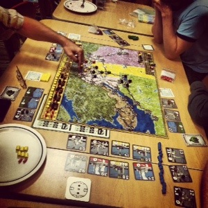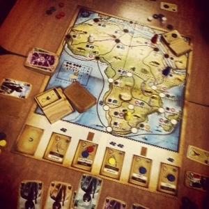 Of the many games being played that evening, I had the opportunity to play a game new to me, 2012’s Africana from Z-Man Games. Playable by up to four participants, Africana uses a few familiar card-driven mechanics within the context of the travel and exploration of the African continent. The game board features a map of Africa divided in two by the equator and laced with routes between cities. Each player’s expedition uses color-coded movement cards to trek between locations. A series of five adventure cards at the bottom of the board allows a player to pick a starting point for a research expedition to another location. Setting off on an adventure gains either a movement card or silver coins used to buy from the two adventure books.