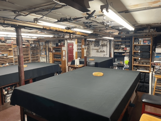 Shelves line the walls of the club, and first-time visitors usually gaze in awe at their contents of hundreds of games and thousands of miniatures. Shelves in the rear hold club-owned terrain – trees, buildings, gaming mats, rivers, roads, hills, and buildings ranging from historical periods to sci-fi and fantasy in multiple scales. A tall rack holds a dozen 4’ x 4’ sheets of plywood where more in-progress games can be stowed. Most of the shelves are rented by members to store personal collections of games and miniatures.