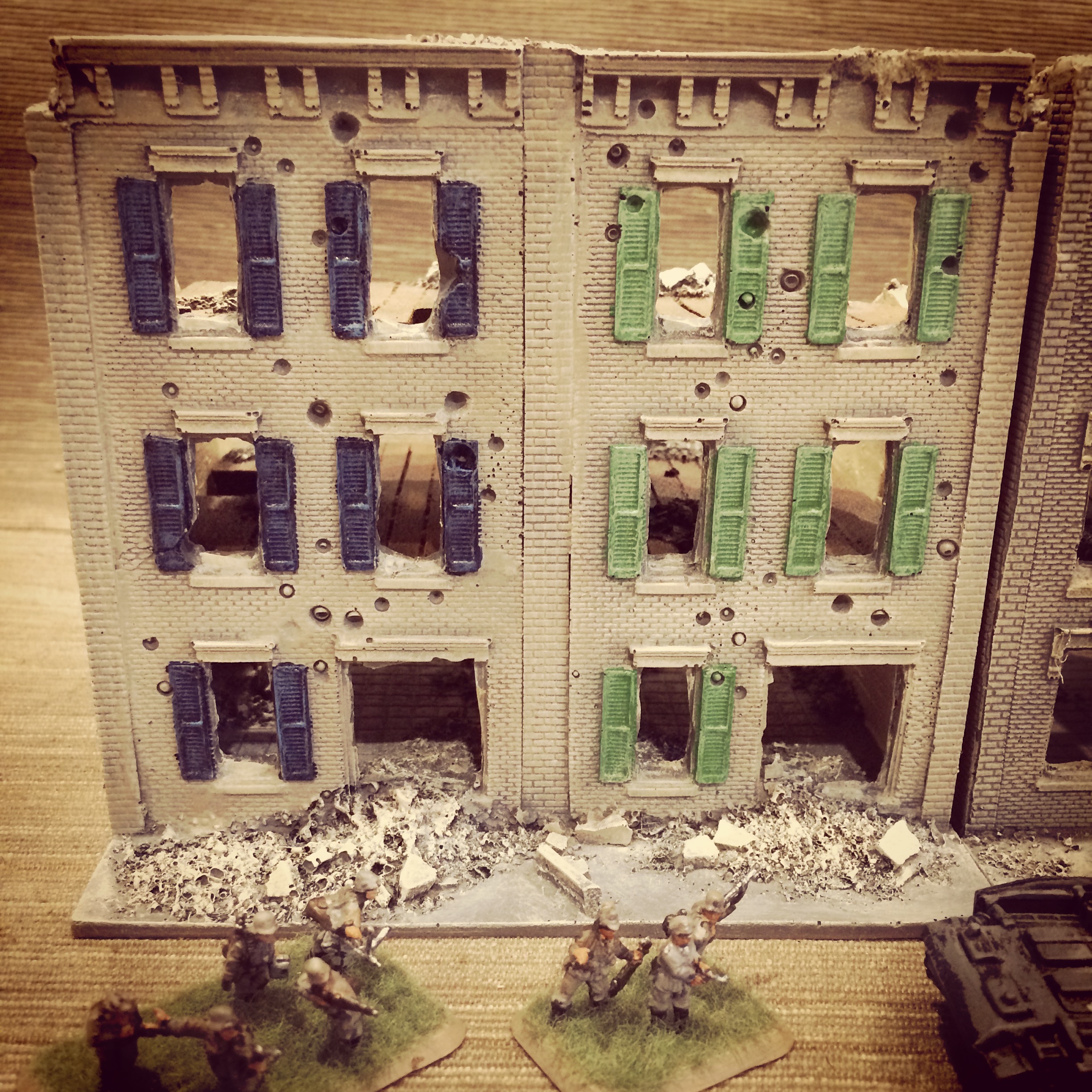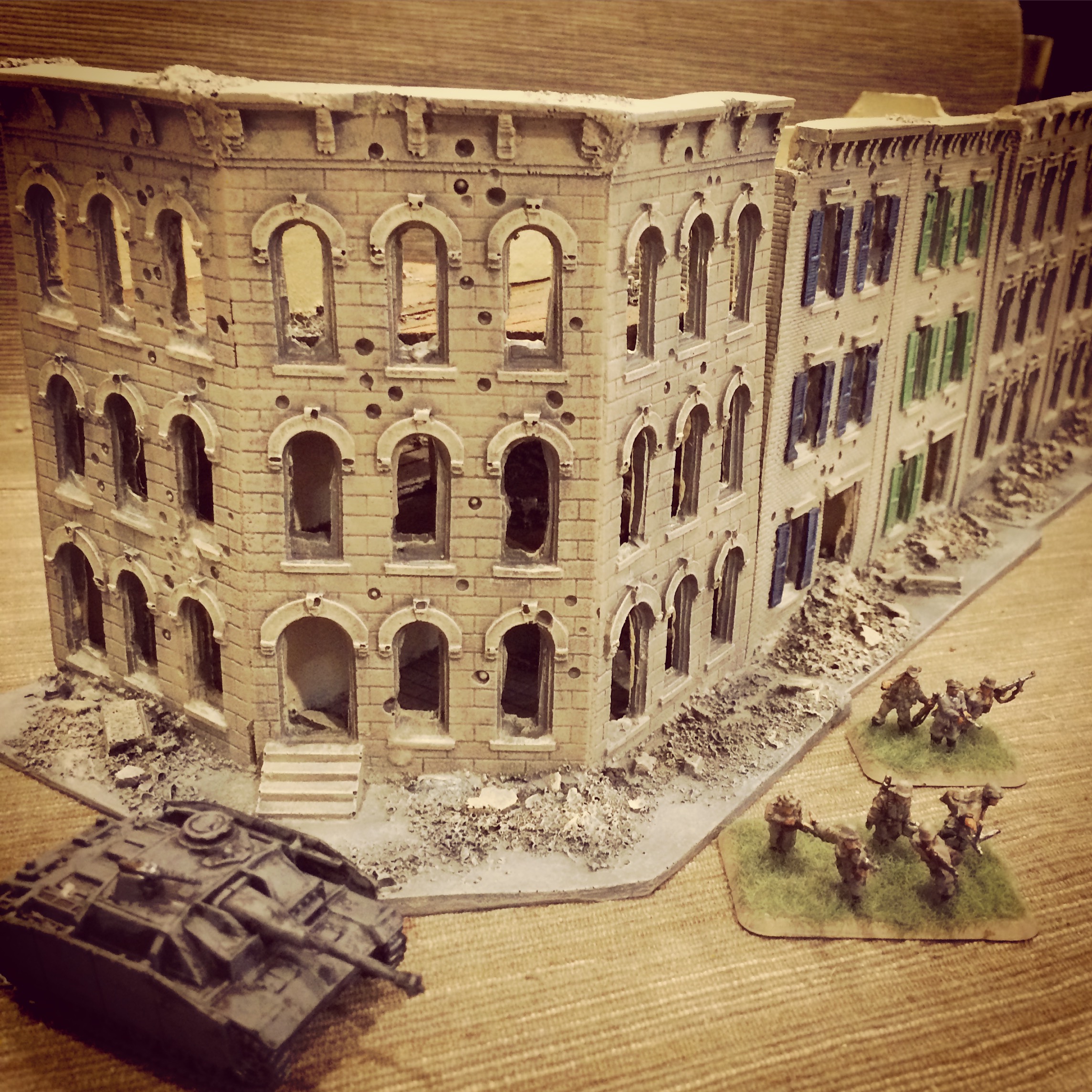 For my 15mm WWII wargaming using Flames of War and I Ain’t Been Shot Mum rules systems, my terrain has been modeled almost entirely on Western Europe using buildings from numerous manufacturers collected over the past few years. In all my 15mm modelling, destroyed buildings have largely been absent so far, so I’ve been really happy to add my new city block ruin models from Novus Design Studio to my terrain collection.