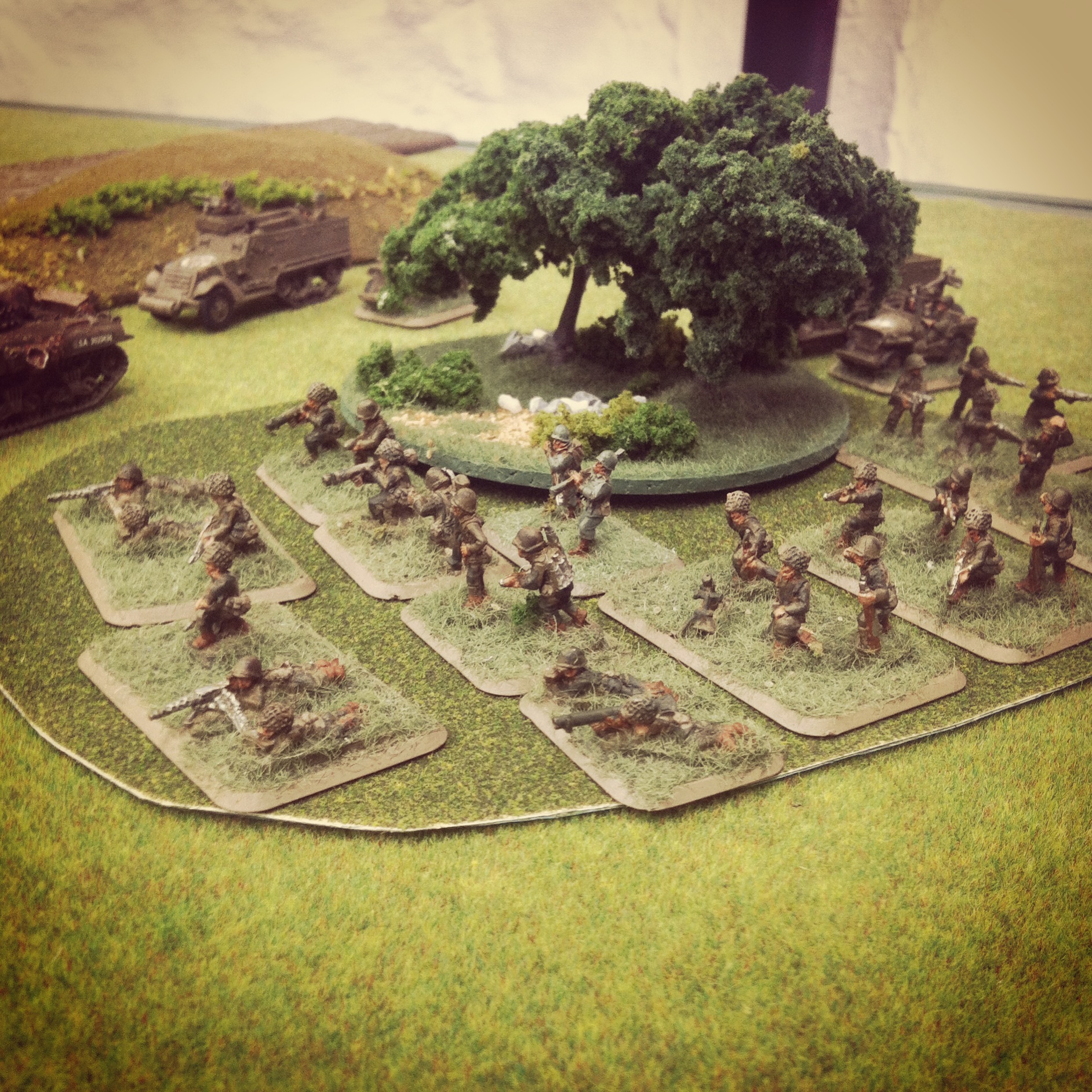 As per the scenario, initial Allied blinds approach a farm outside Vierville where a German blind sits unknowingly in the complex of buildings. With Allied infantry closing in over dense bocage hedgerows and orchards, a firefight erupted and drove the German defenders through the buildings and into the orchard beyond.