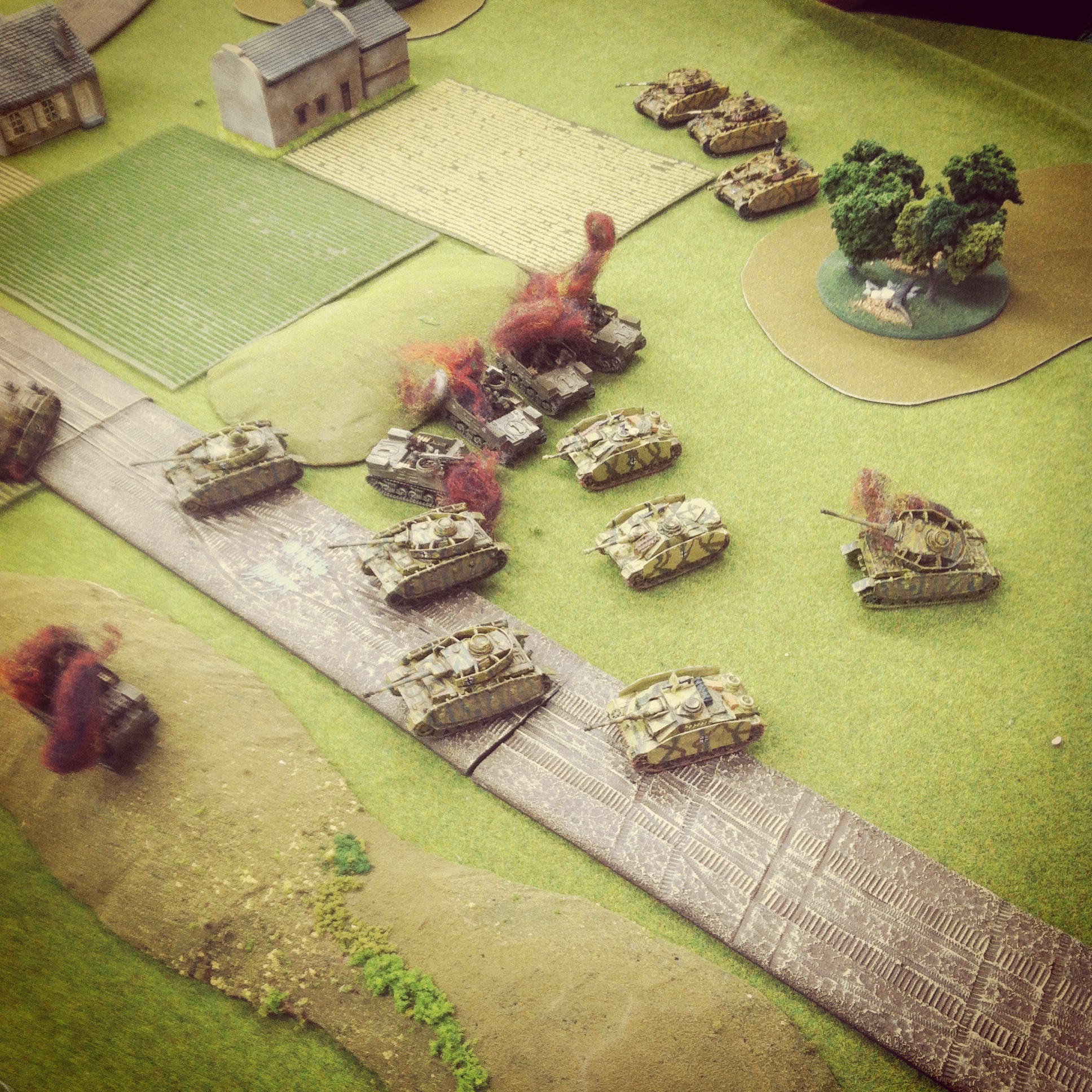 A Panther meets its end at the hand of the British Royal Artillery as a close assault is attempted on another in the woods nearby