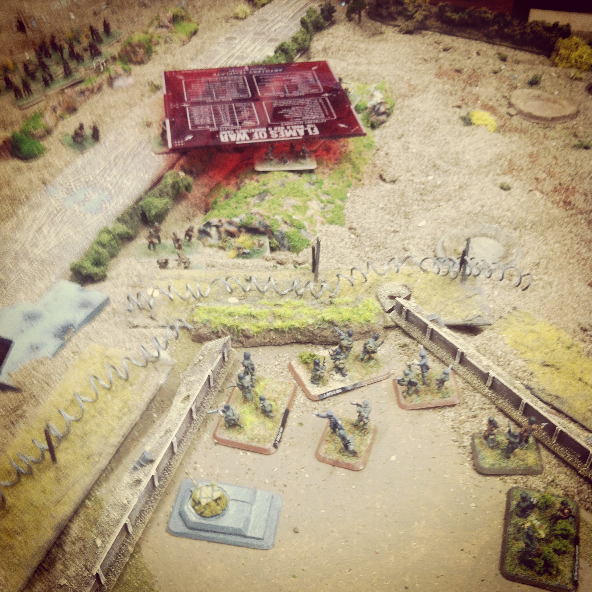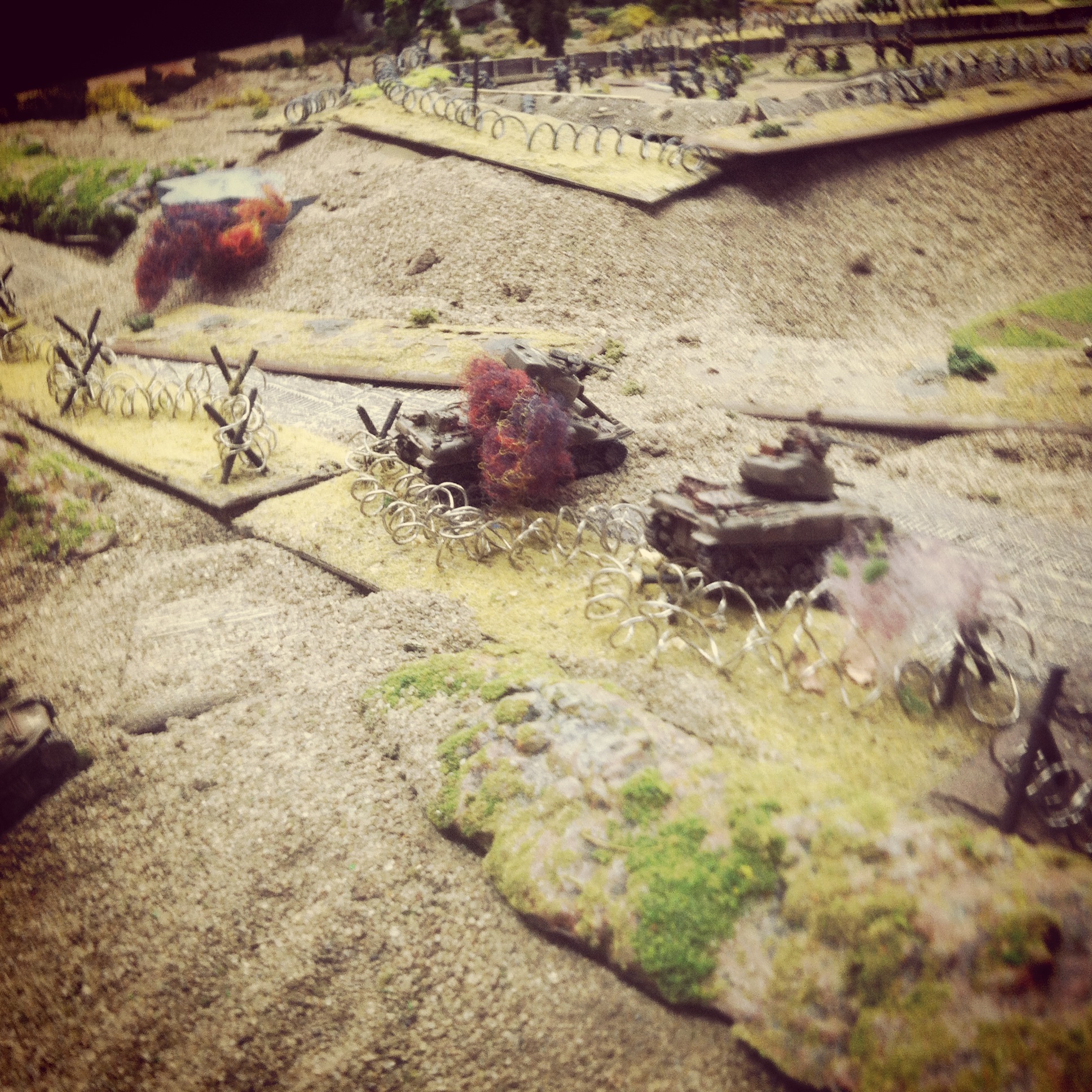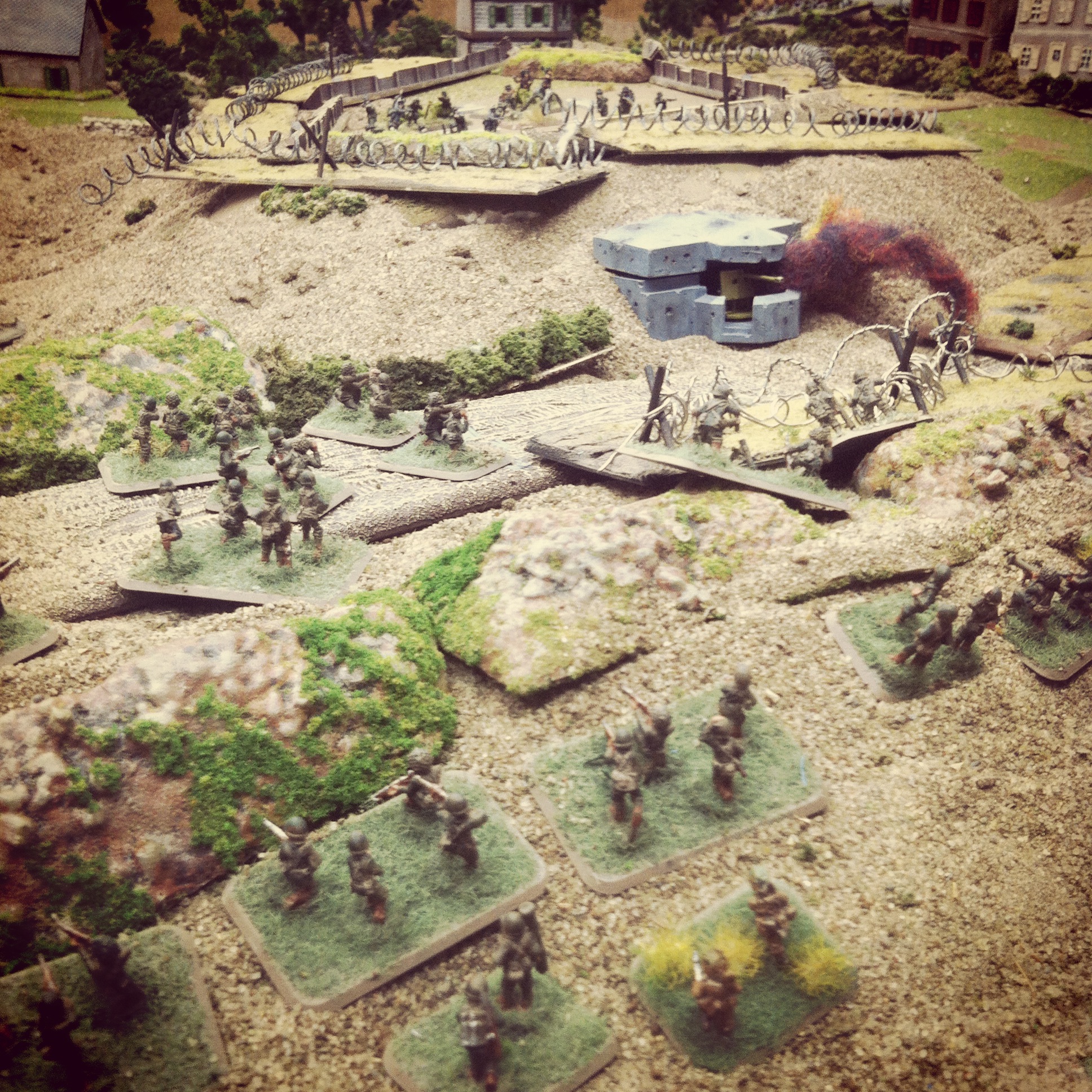 The opening turns found a lot of US boats on the beach and a quick push to the seawall. So early combined arms fire managed to destroy the main bunker at the beach, but the battle was far from over. The initial US push followed on to the left of the beach, but multiple turns at clearing the barbed wire stalled the advance as the Americans took heavy fire.