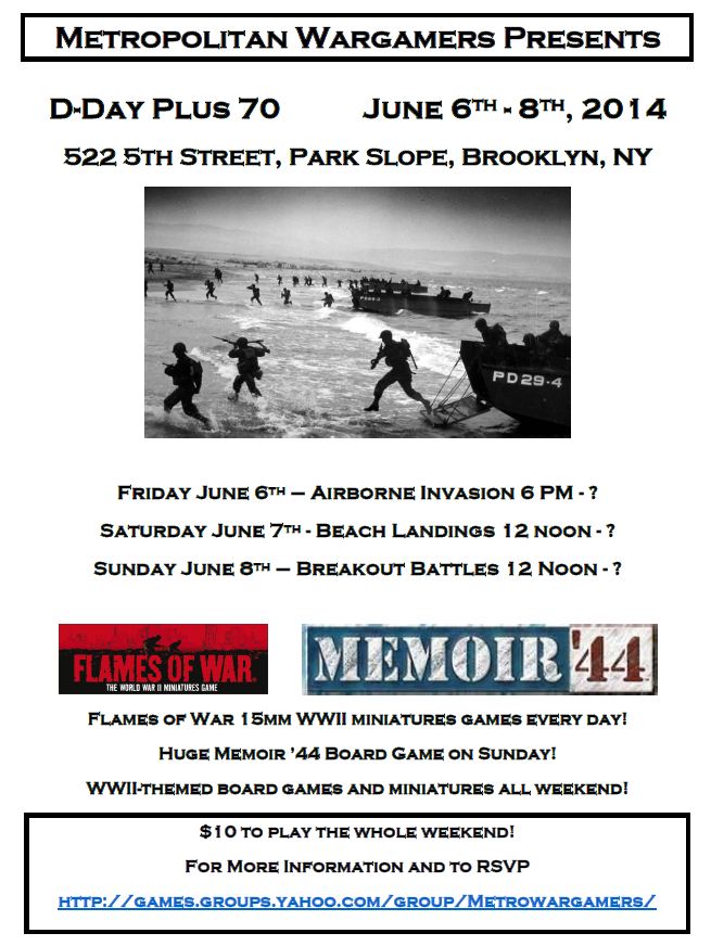 This past weekend at Metropolitan Wargamers in Brooklyn, NY, dozens of gamers came together for three days commemorating the 70th anniversary of the Allied invasion of Normandy on June 6, 1944. Throughout the weekend, we ran multiple WWII-themed games, including Normandy ’44, I Ain’t Been Shot Mum, Flames of War, World In Flames and Memoir ’44. Dice were rolled, strategies were debated, prizes were won and Allied and Axis forces vied for control of France. In all, it was another great weekend full of gaming at our club’s space in the heart of Brooklyn.